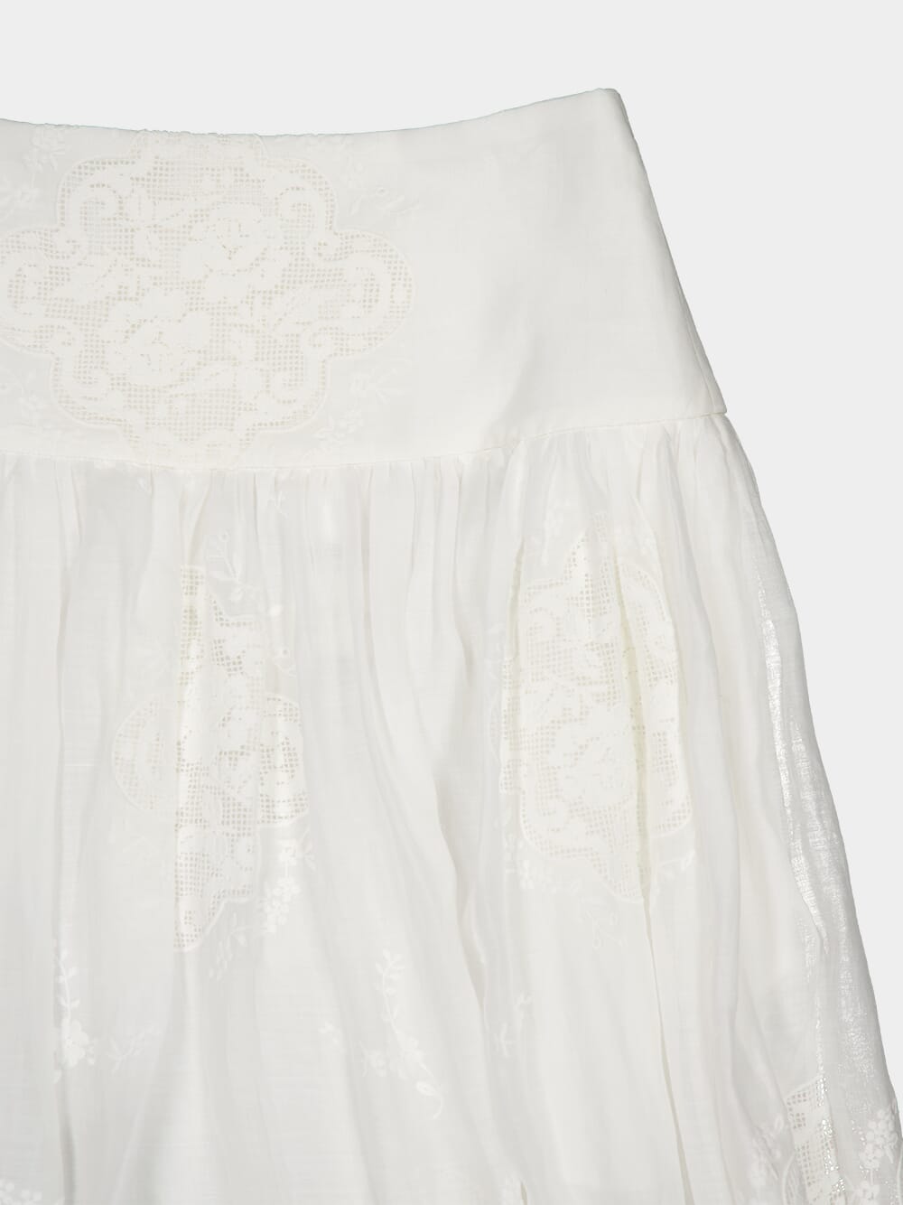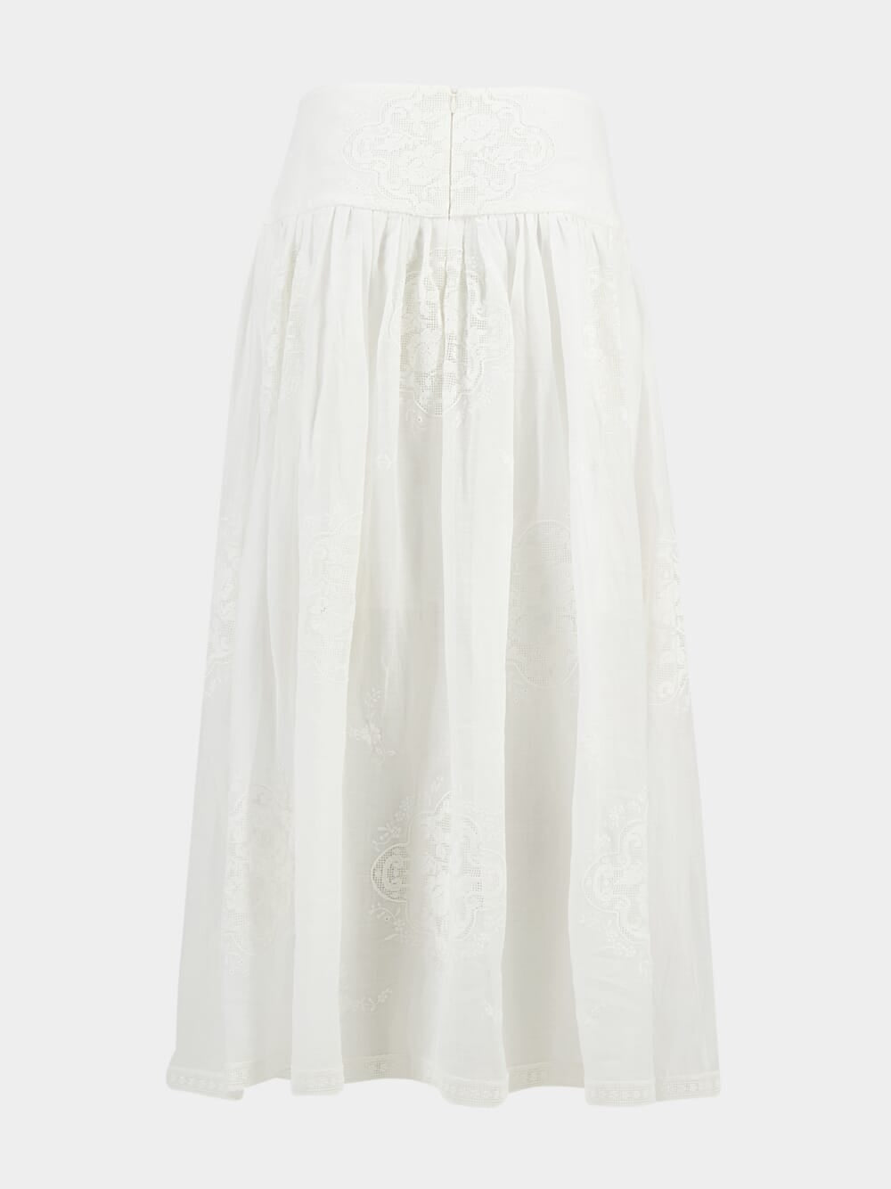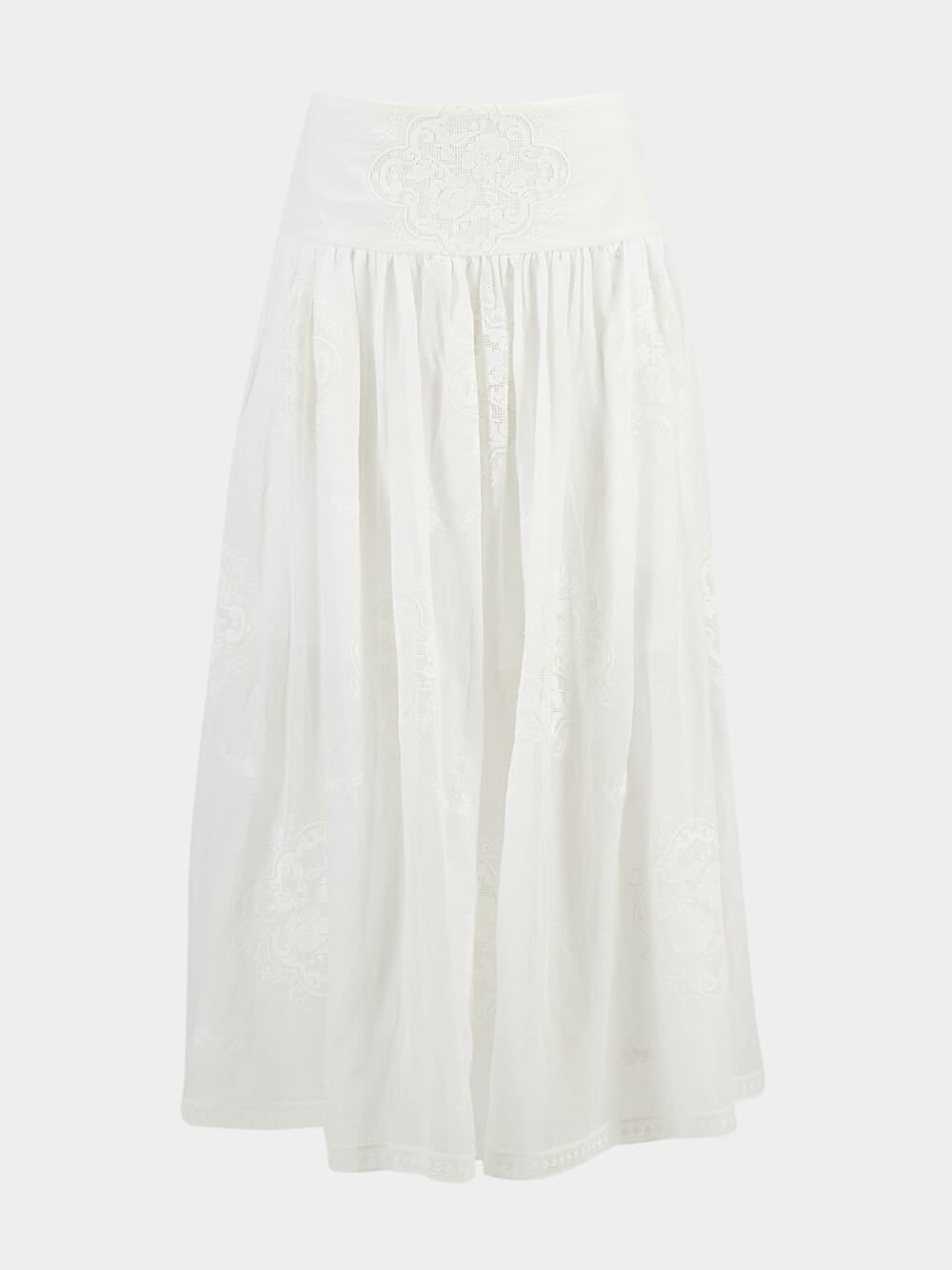 This white maxi skirt is a vision of romantic grace with its intricate embroidery and flowing design. The comfortable elastic waistband and delicate fabric make it perfect for a relaxed yet elegant look, ideal for weekend outings or casual events.