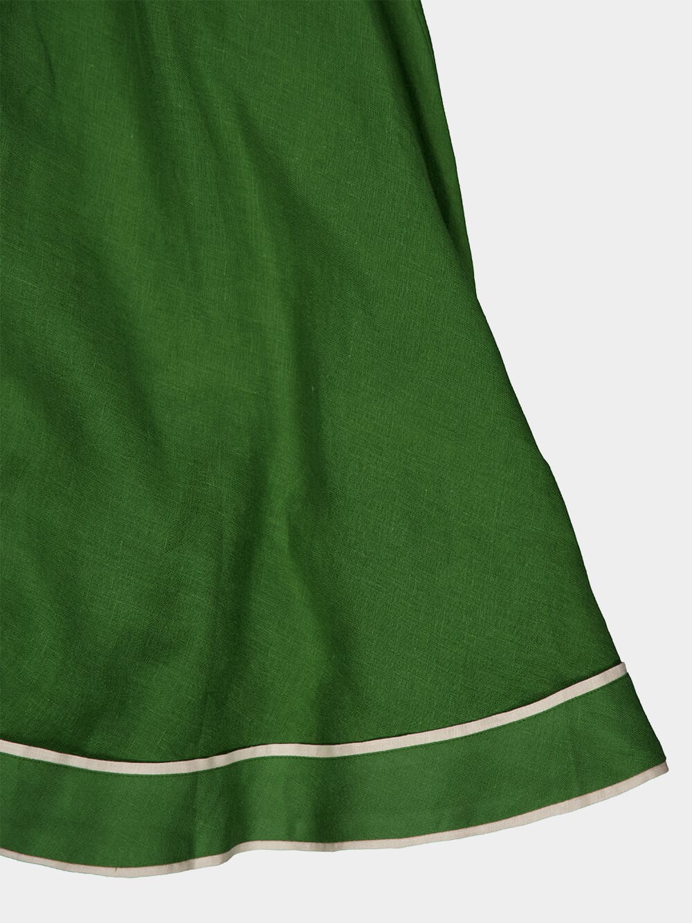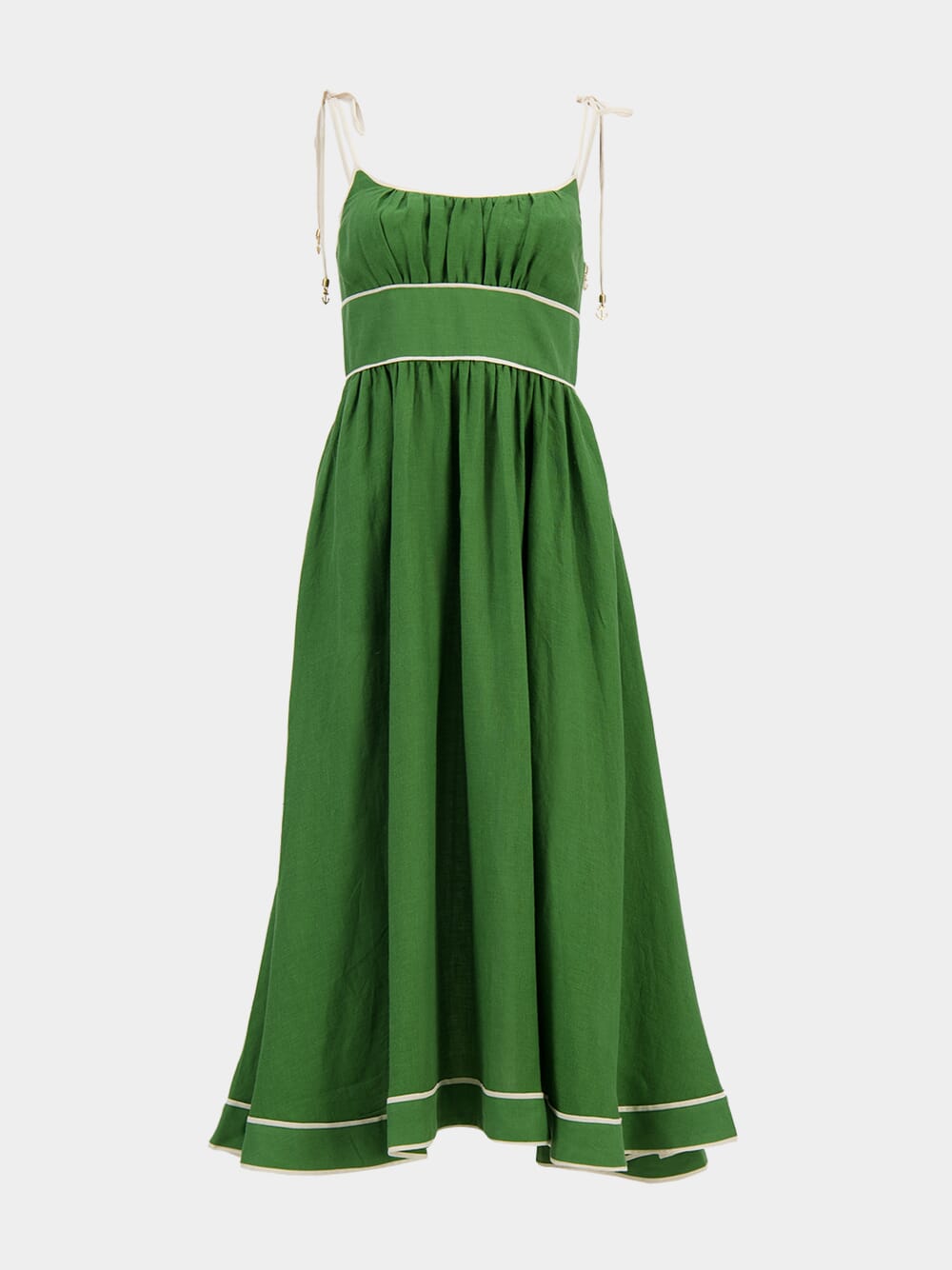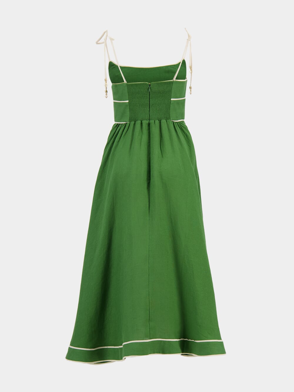 This olive green sundress with white trim detailing is a summer staple. Designed with rope-like straps and a gathered waist, it offers a blend of casual charm and feminine elegance. The airy linen material promises cool comfort on warm days.