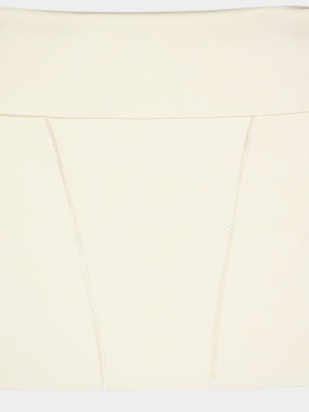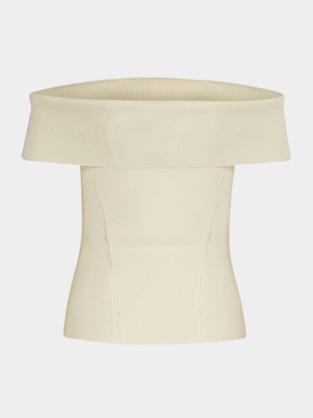 This off-shoulder cream top combines elegance with contemporary design. The fold-over neckline exudes sophistication, while the form-fitting shape flatters the figure. Perfect for a refined yet trendy look.