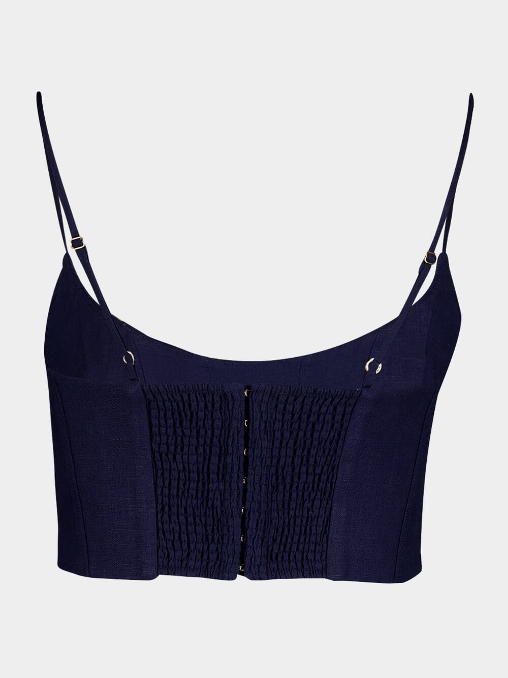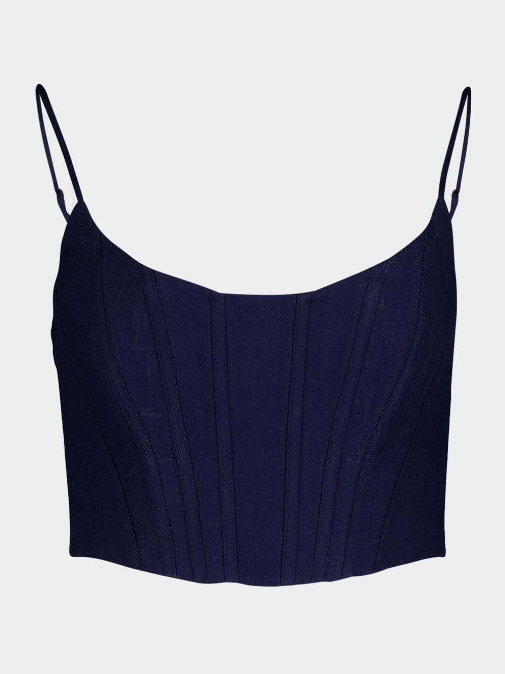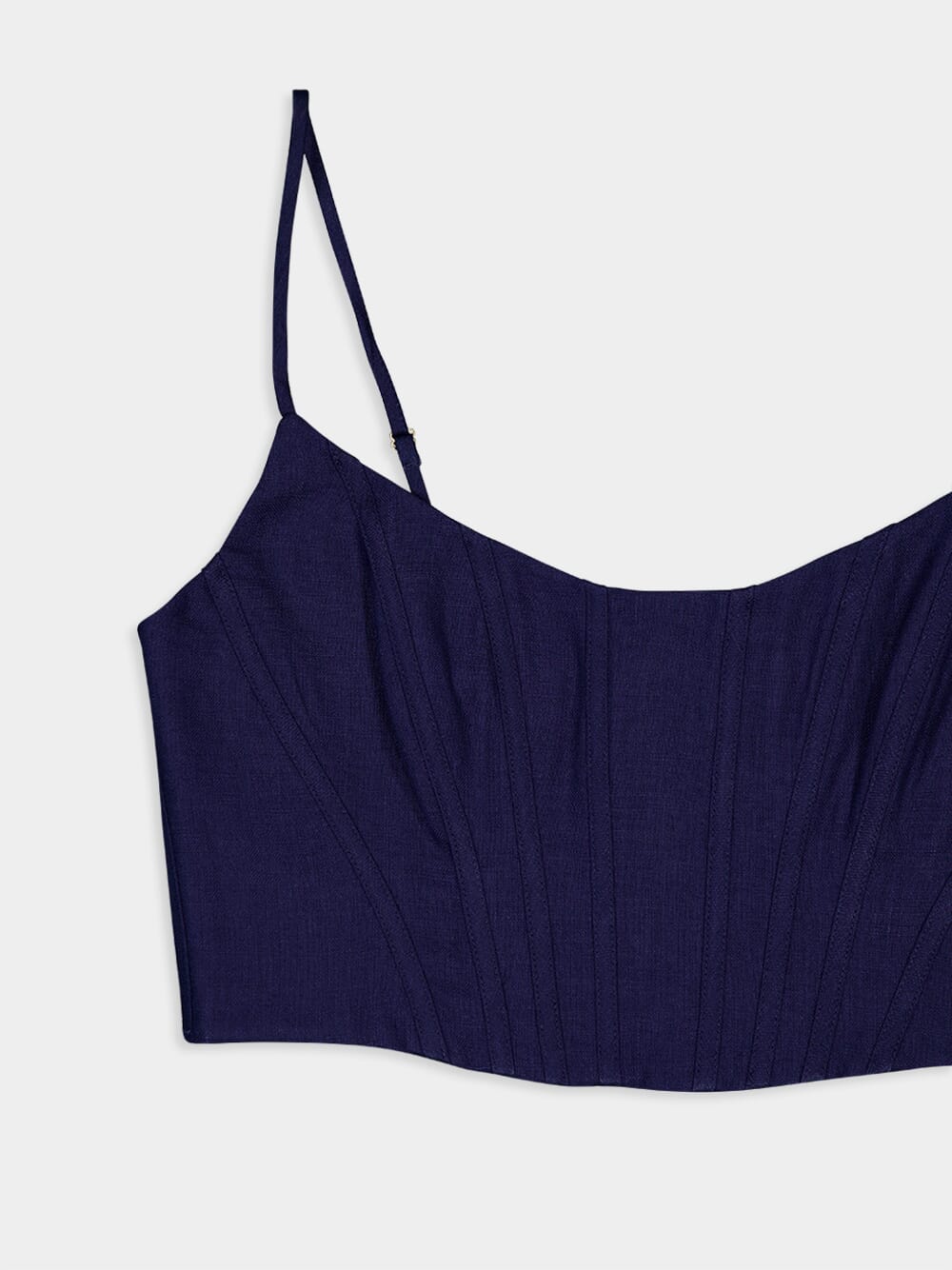 This navy pleated crop top merges sophistication with a hint of playfulness. Its structured bodice and delicate straps make it a versatile piece that can be dressed up or down, perfect for a night out or a casual day event.