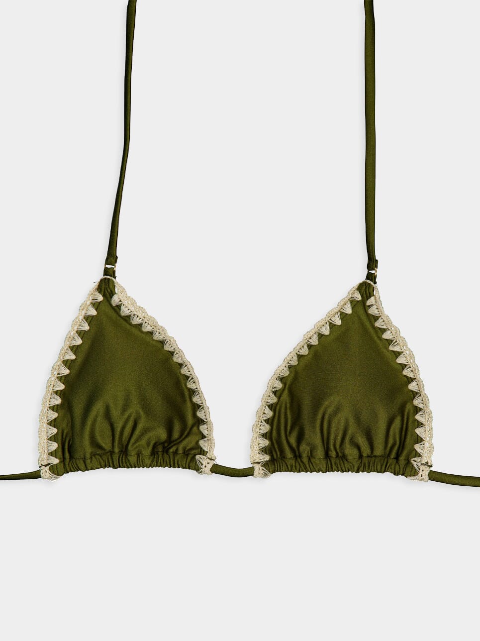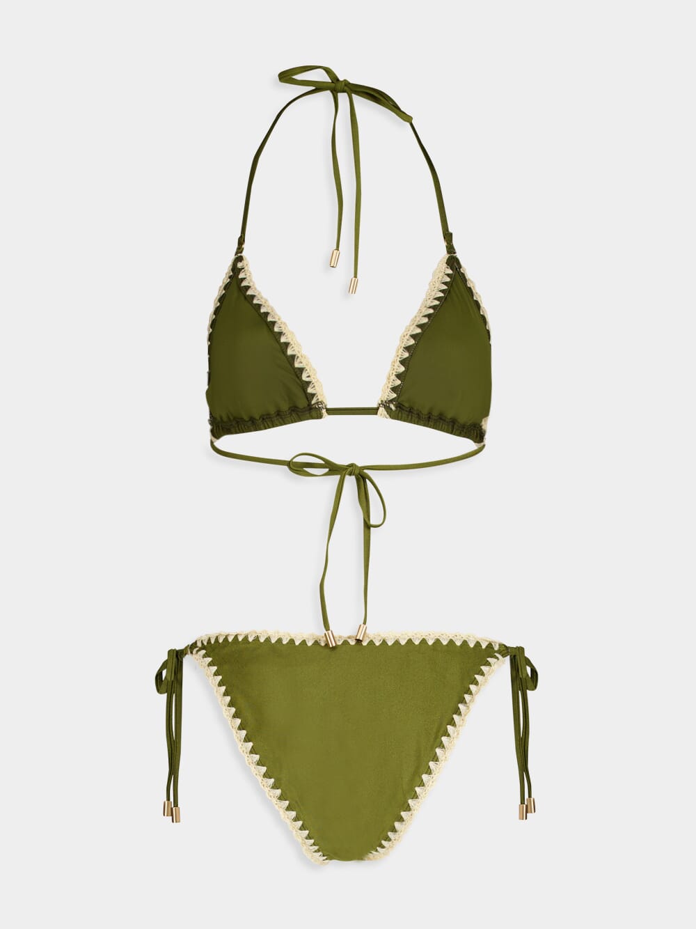 This olive triangle bikini set with cream crochet trim offers a bohemian twist on a classic design. The tie-up details and metallic accents create a look that's both laid-back and luxurious, perfect for beach days or lounging by the pool.