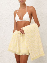 From Zimmermann’s Summer Swim 2025 Collection, the Jacquard Towel in yellow and cream brings a touch of luxury to seaside lounging. Woven entirely from soft cotton, it features an intricate jacquard pattern throughout and is finished with delicately fringed edges and discreet branding at each end. Generously sized at 180cm by 100cm, this towel is both elegant and practical, perfect for sun-drenched escapes and poolside relaxation.