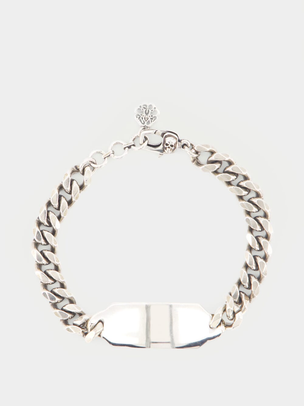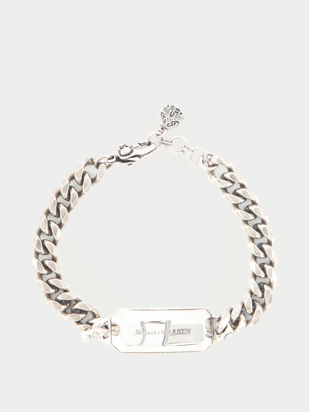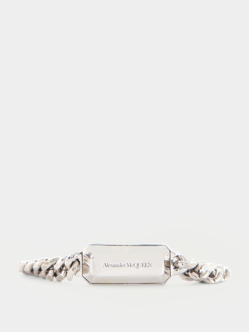 ALEXANDER MCQUEEN Chain Medallion Bracelet crafted with meticulous craftsmanship, this bracelet features a sleek silver chain adorned with a captivating medallion charm. The intricate metal detailing adds a touch of sophistication and uniqueness to this statement piece. With its adjustable design and comfortable fit, this bracelet effortlessly adds a touch of elegance and glamour to any ensemble.