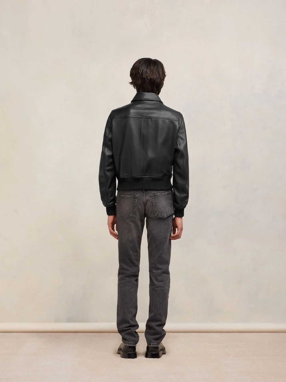 Zipped Leather Jacket, designed for an adjusted fit that's perfect for both men and women. This unisex product is fully lined for comfort and warmth. Featuring a sleek nickel-colored metal zipper with double sliders, and pullers engraved with the Ami logo, it exudes a touch of sophistication. The jacket also comes with welt pockets, and waist and cuff ribs for added style and versatility.