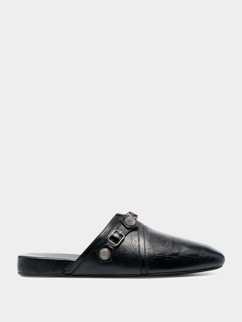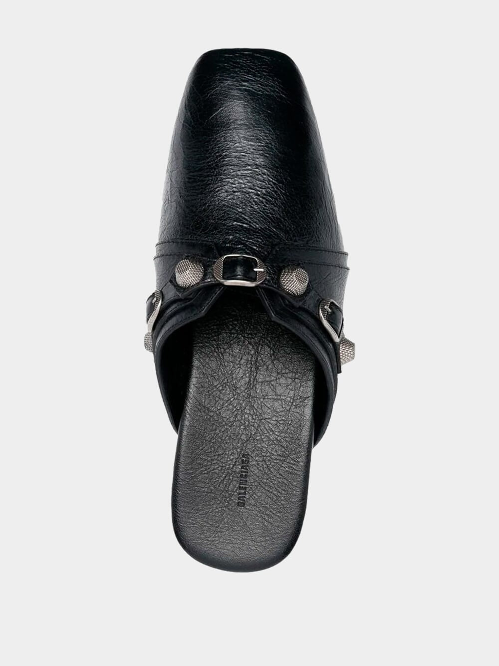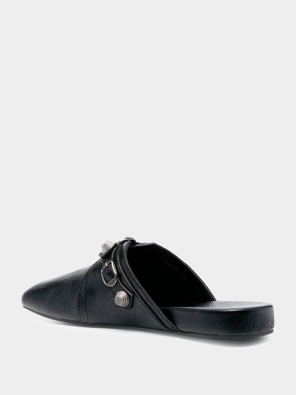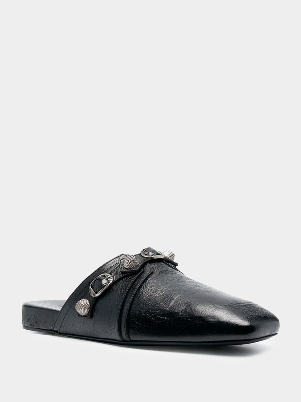 Balenciaga Cosy Cagole mules in black arena lambskin featuring semi-square toe, open at back, aged-silver studs and buckles on the upper and embossed Balenciaga logo on sole part.