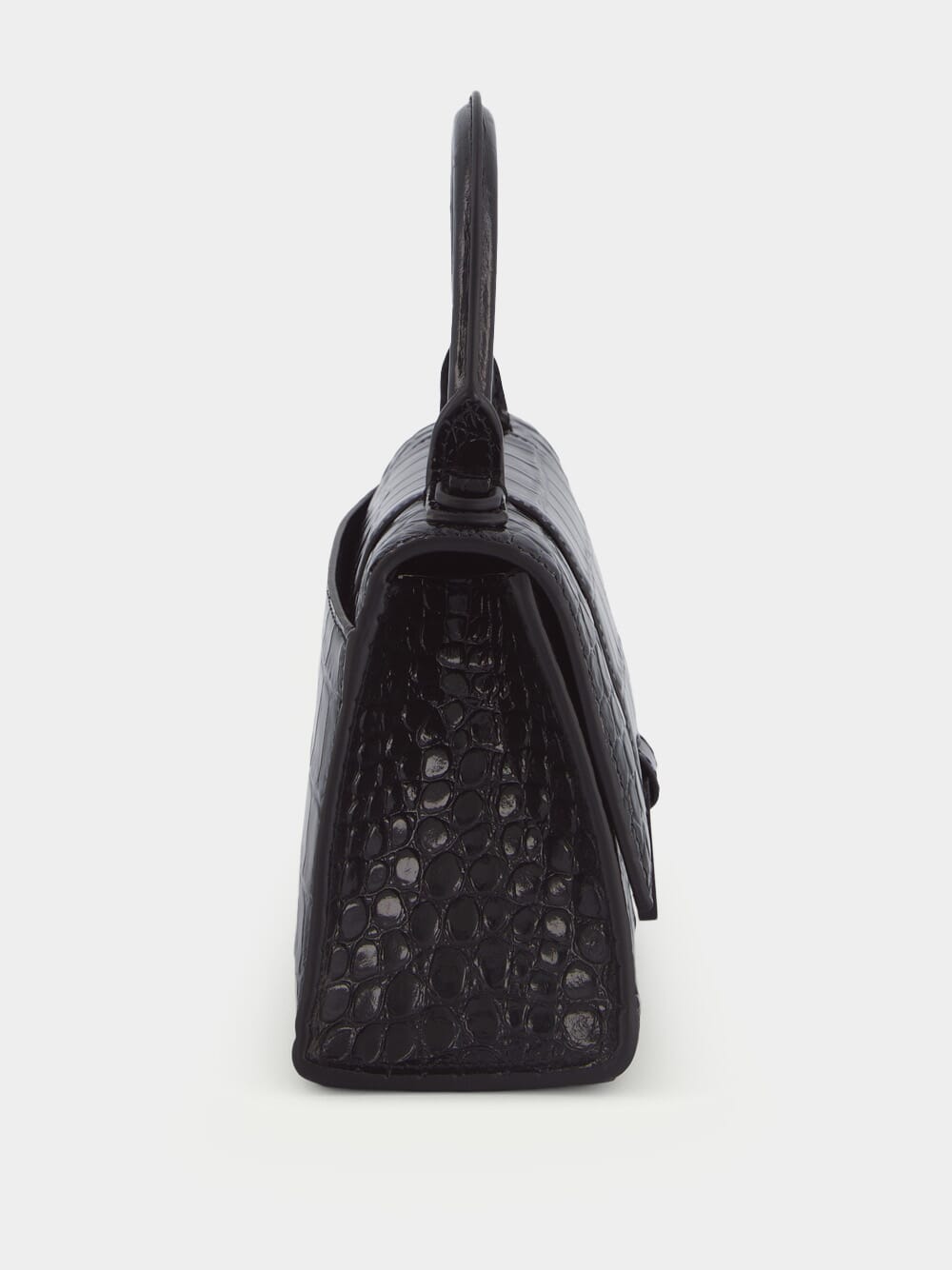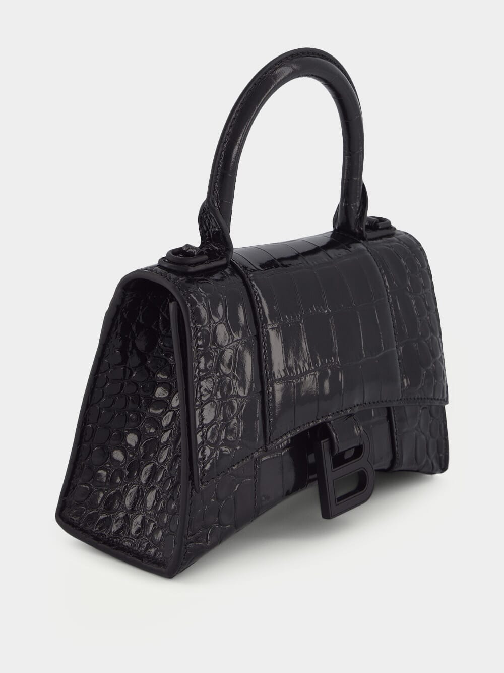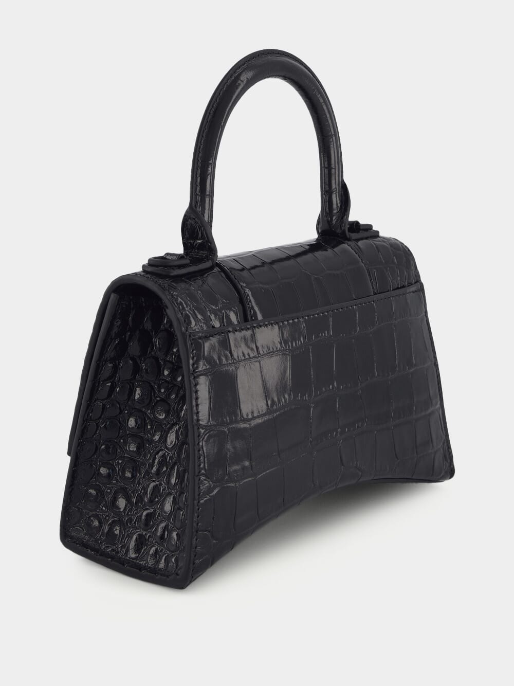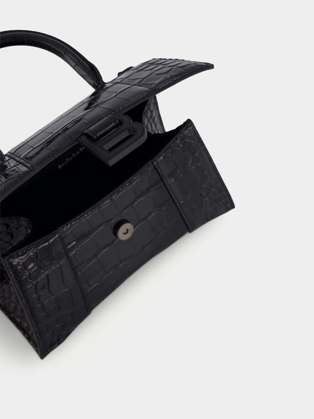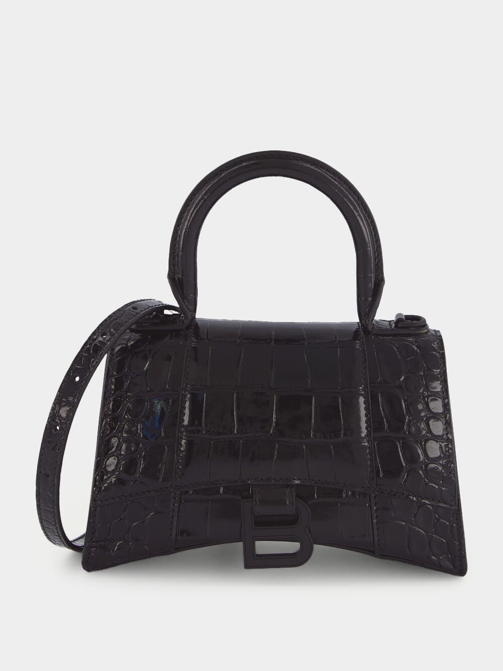 Balenciaga Hourglass XS black shiny crocodile embossed leather handbag with curvilinear base and black matte B hardware.