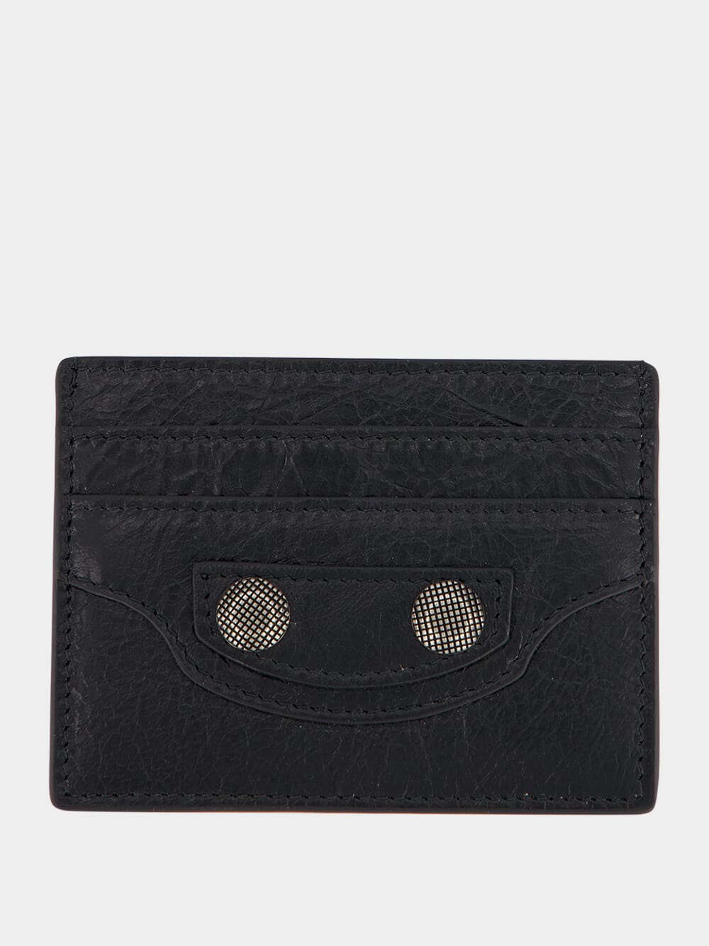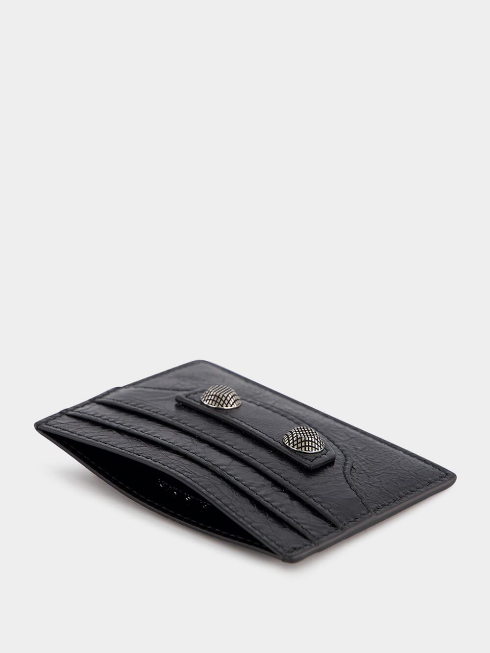 Le Cagole Leather Cardholder by Balenciaga. Crafted from luxurious Arena lambskin, this cardholder is the epitome of style and functionality. Featuring a subtle embossed Balenciaga logo at the back and aged-silver hardware, it exudes timeless elegance. With four card slots and a convenient bill pocket, it provides effortless organization for your daily needs.