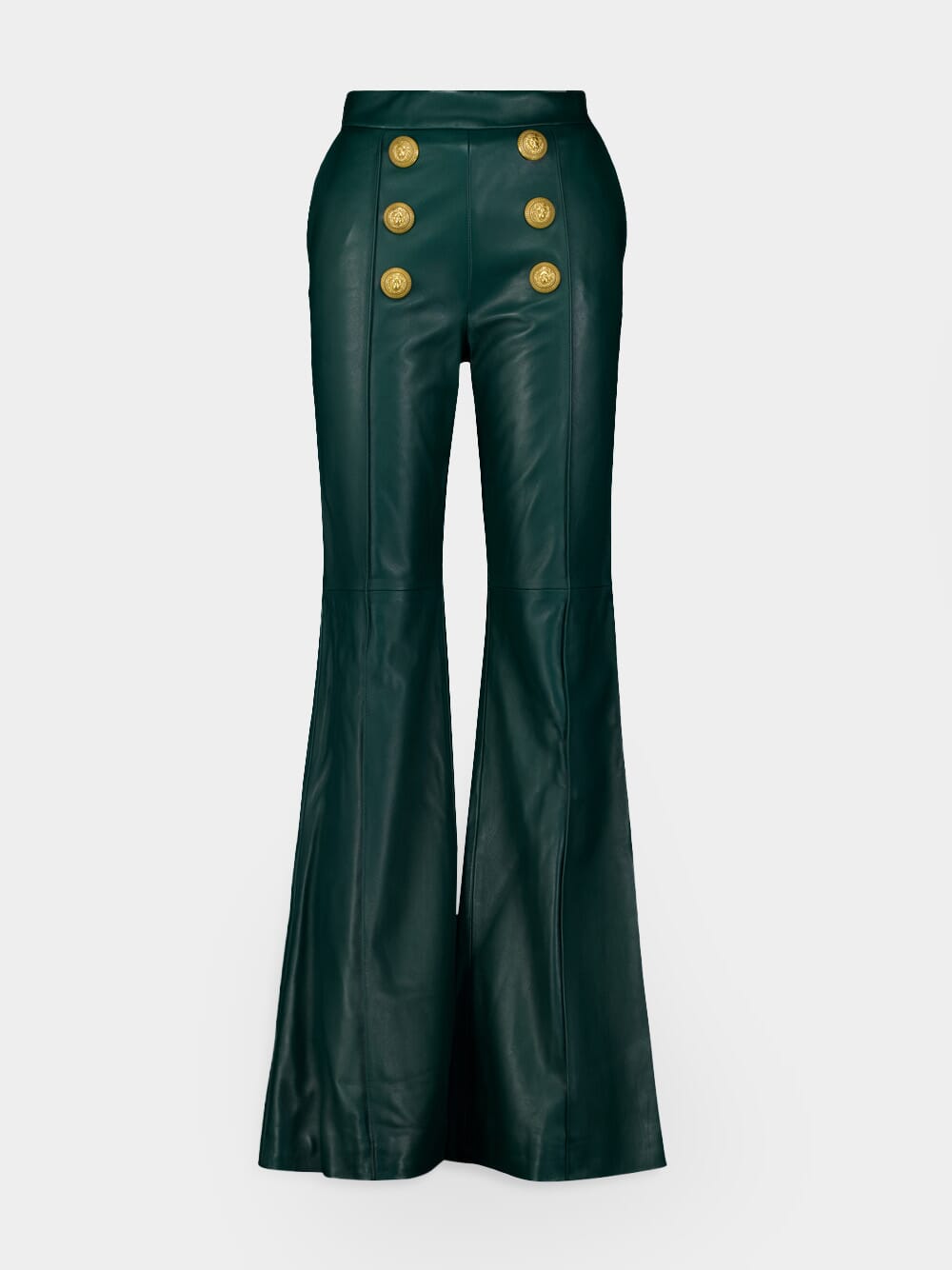 Button-Embellished Leather Flared Trousers, crafted with precision from premium leather, these trousers feature exquisite embossed gold-tone buttons that add a touch of opulence to your look. The two side inset pockets provide both style and functionality, while the exposed rear zip fastening ensures a seamless fit. Embrace the fashion-forward design with a flared hem and extra-long length, adding an elegant flair to your outfit.