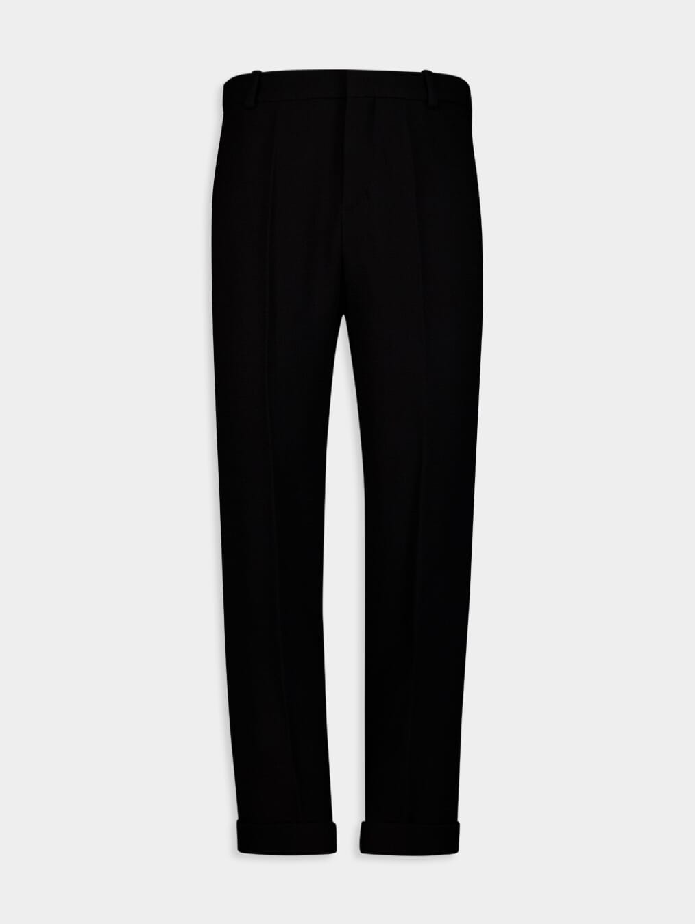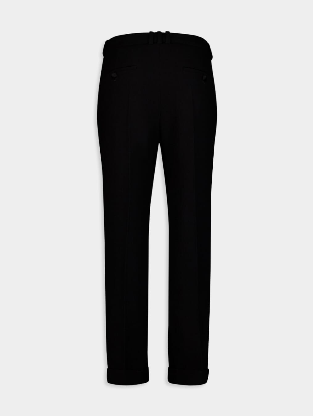 Crepe Straight-Cut Wool Trousers, exquisitely tailored for refined style. These trousers feature a double cuff design, adding a touch of sophistication to your ensemble. Equipped with 2 Italian pockets and 2 welt pockets on the back, they offer both practicality and flair. The satin-covered buttons and triple belt loop at the back add a luxe finish.