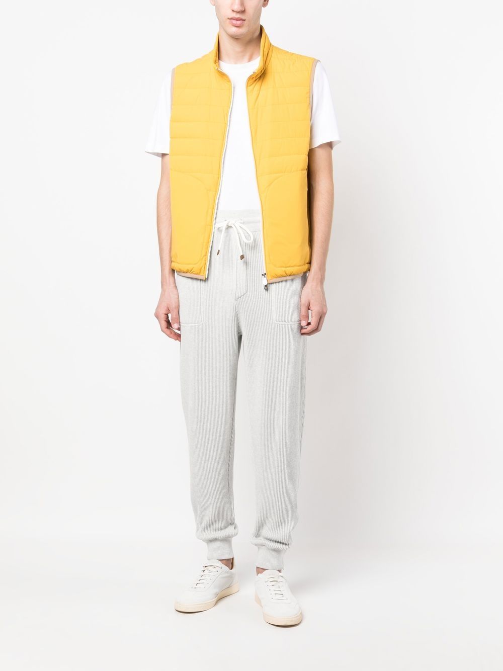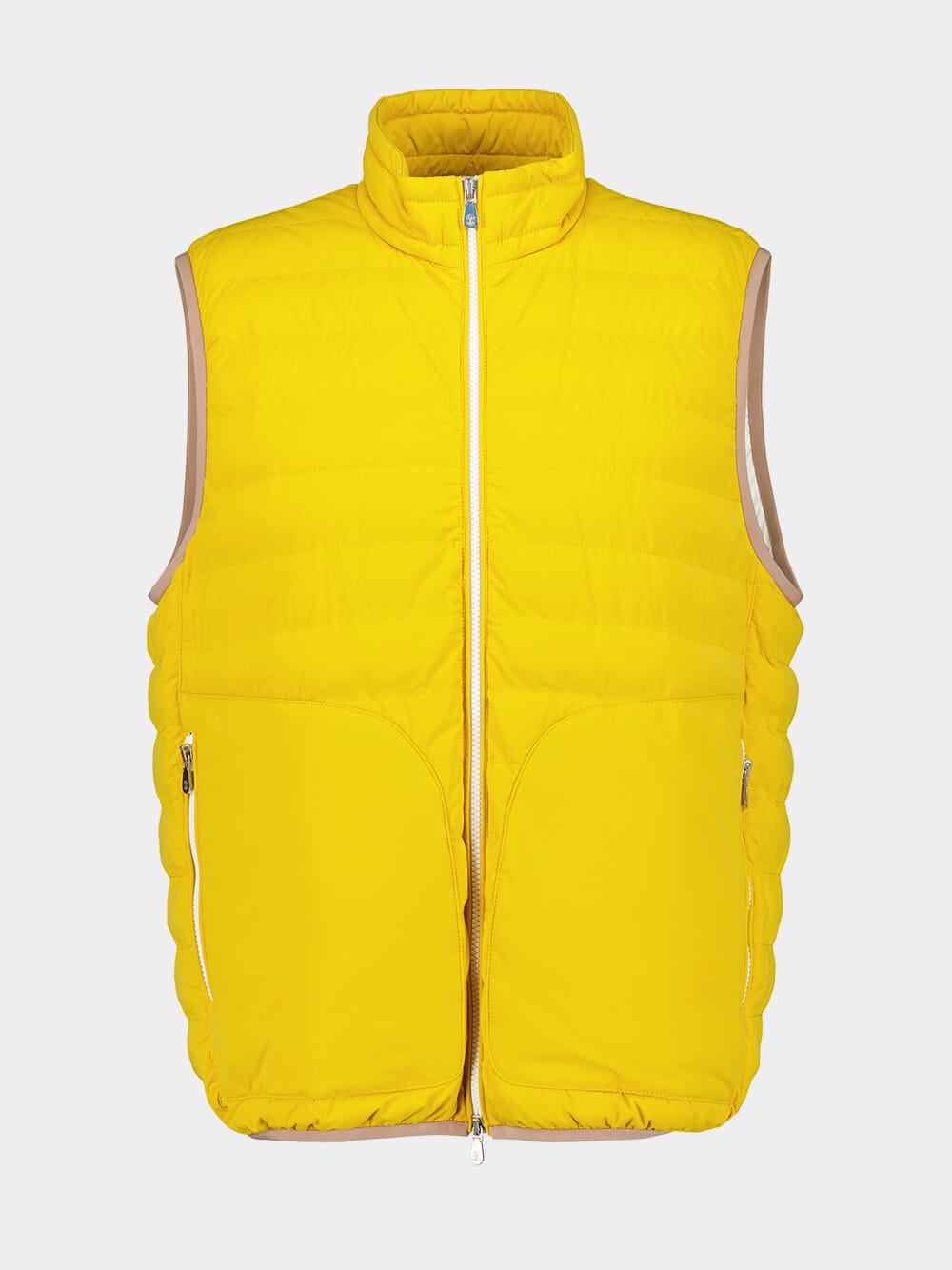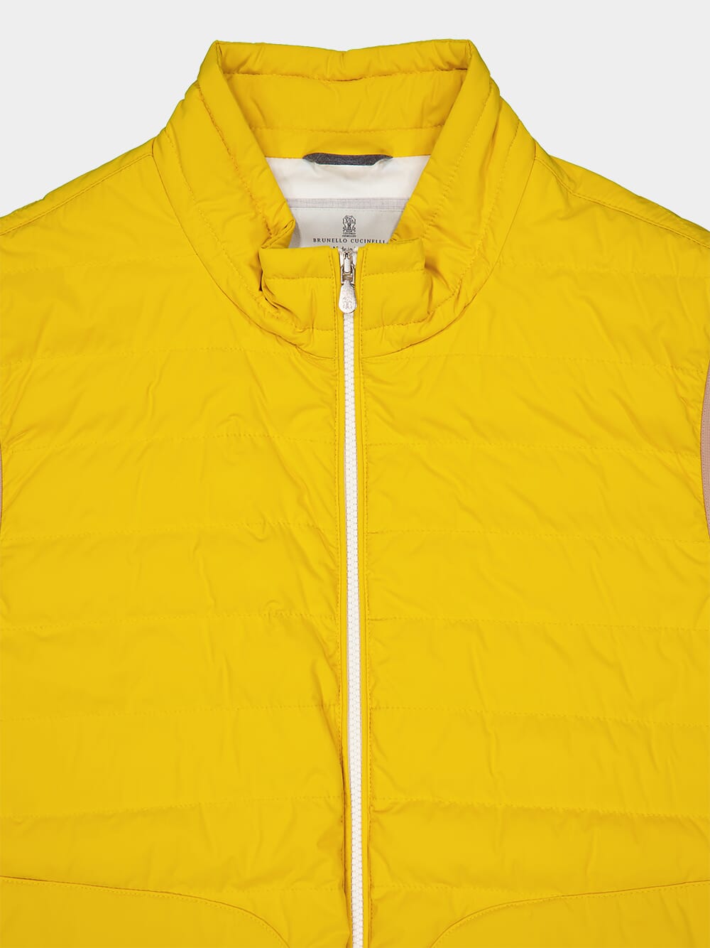 Brunello Cucinelli yellow nylon lightweight padded vest with two-way zip closure.