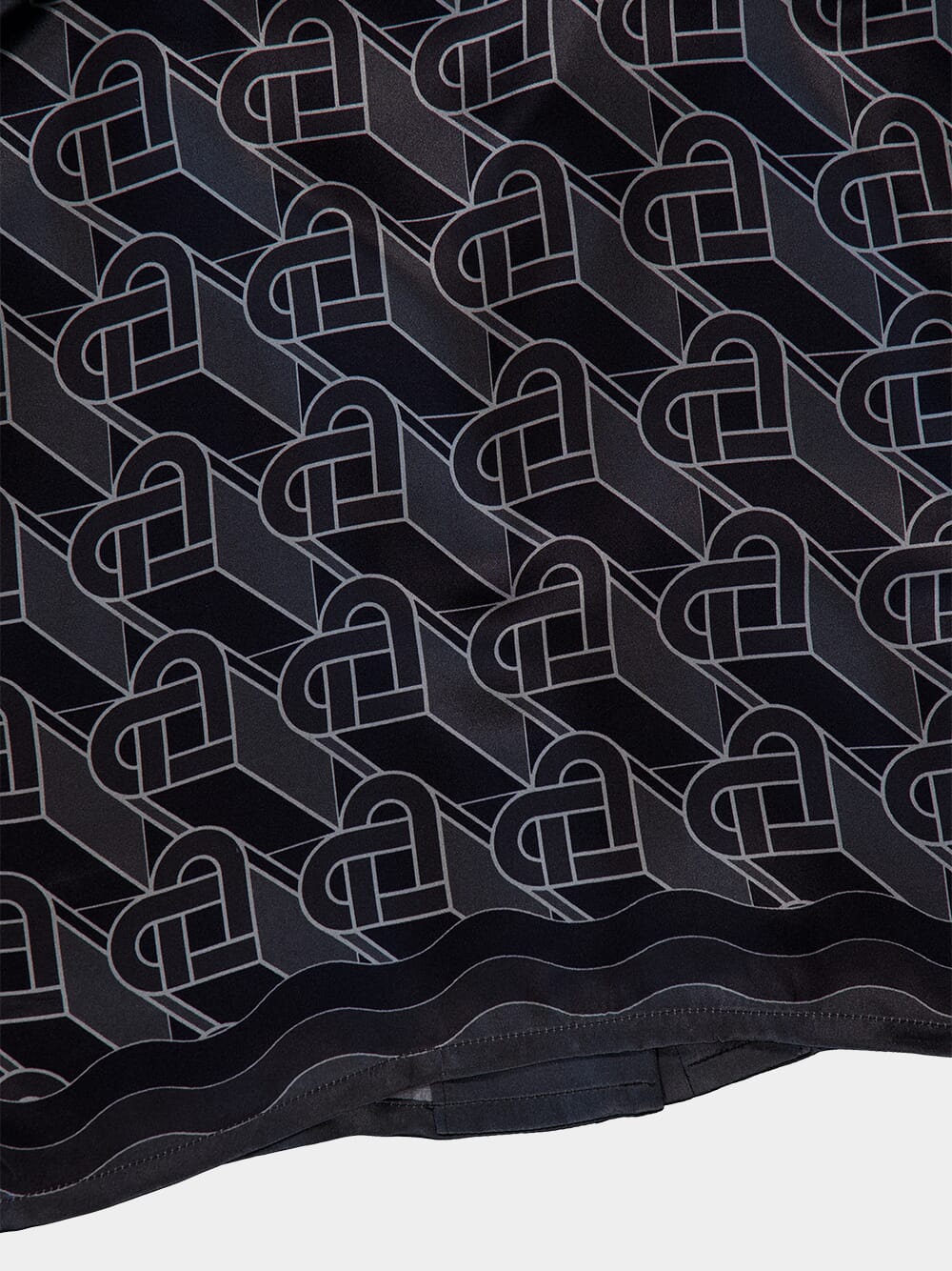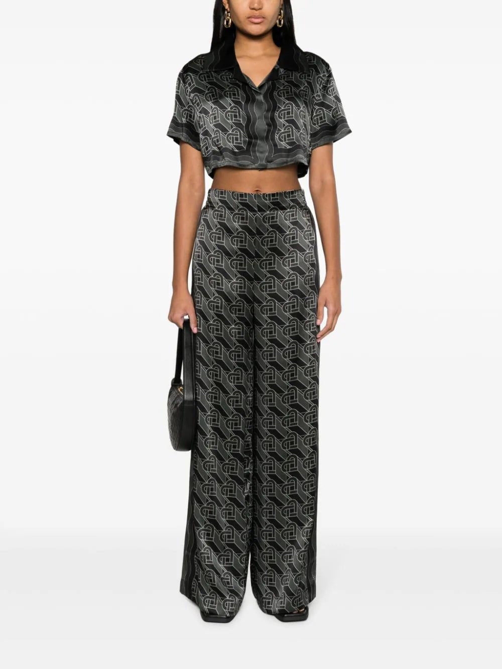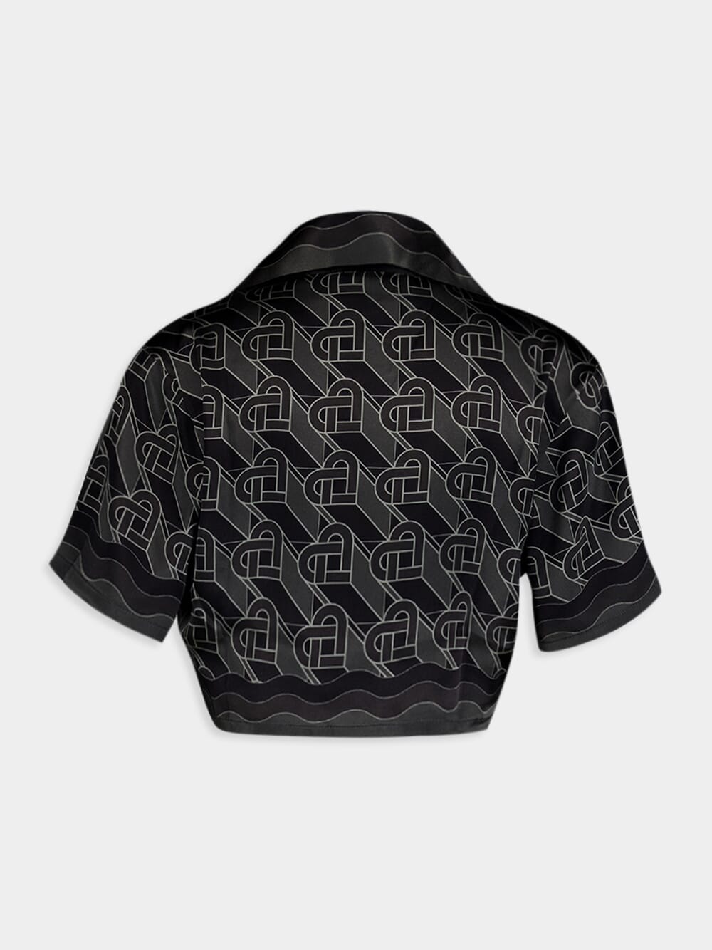 Heart Monogram-Print Cropped Shirt, featuring a luxurious satin weave and a playful monogram pattern. The chic stripe trim adds a modern edge to the camp collar design. With a concealed front button fastening and short sleeves, this shirt effortlessly combines sophistication and ease. The cropped silhouette and straight hem make it a trendy and versatile addition to your wardrobe, perfect for making a bold fashion statement.