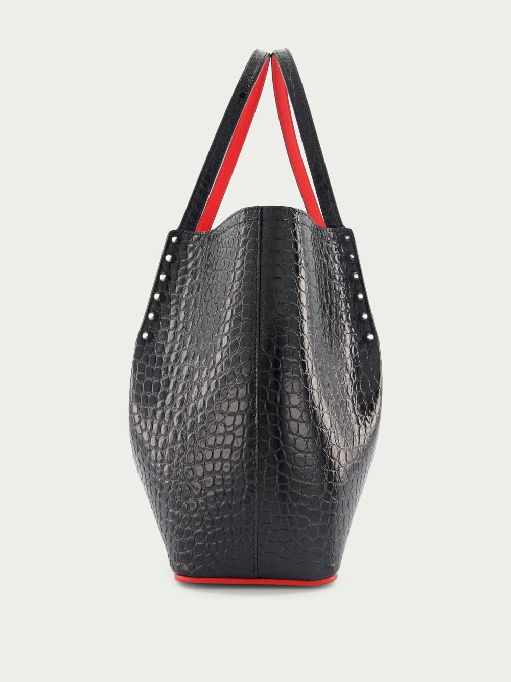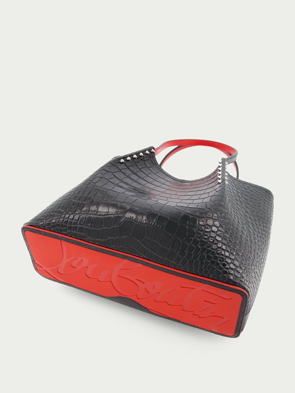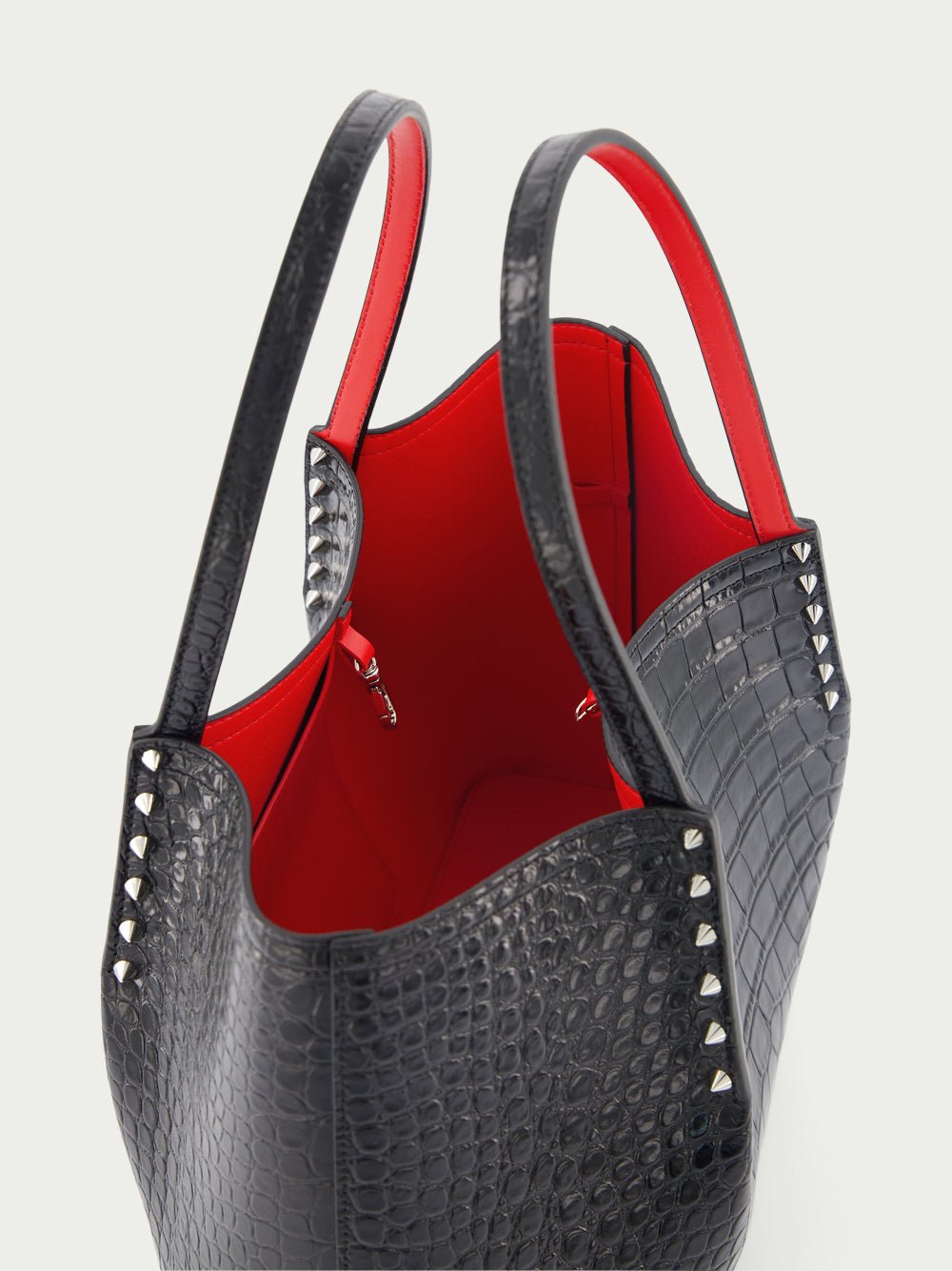 Christian Louboutin Cabarock small leather tote bag crafted from glossy stamped calfskin leather, this tote bag features a modern textured appearance that is sure to catch the eye. The interior of the bag boasts the brand's signature Maison Christian Louboutin design, with ample space for all your daily essentials. The small size of this tote bag makes it the perfect choice for those on the go, with its compact yet functional design.