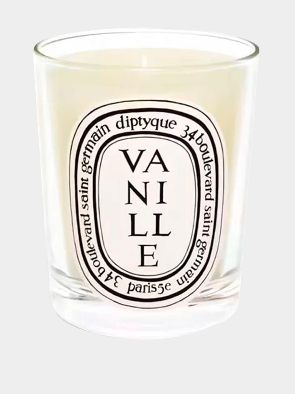 Diptyque Vanille 190g candle with vanilla and smoky notes, in a glass cup. Burning time: 60 hours.