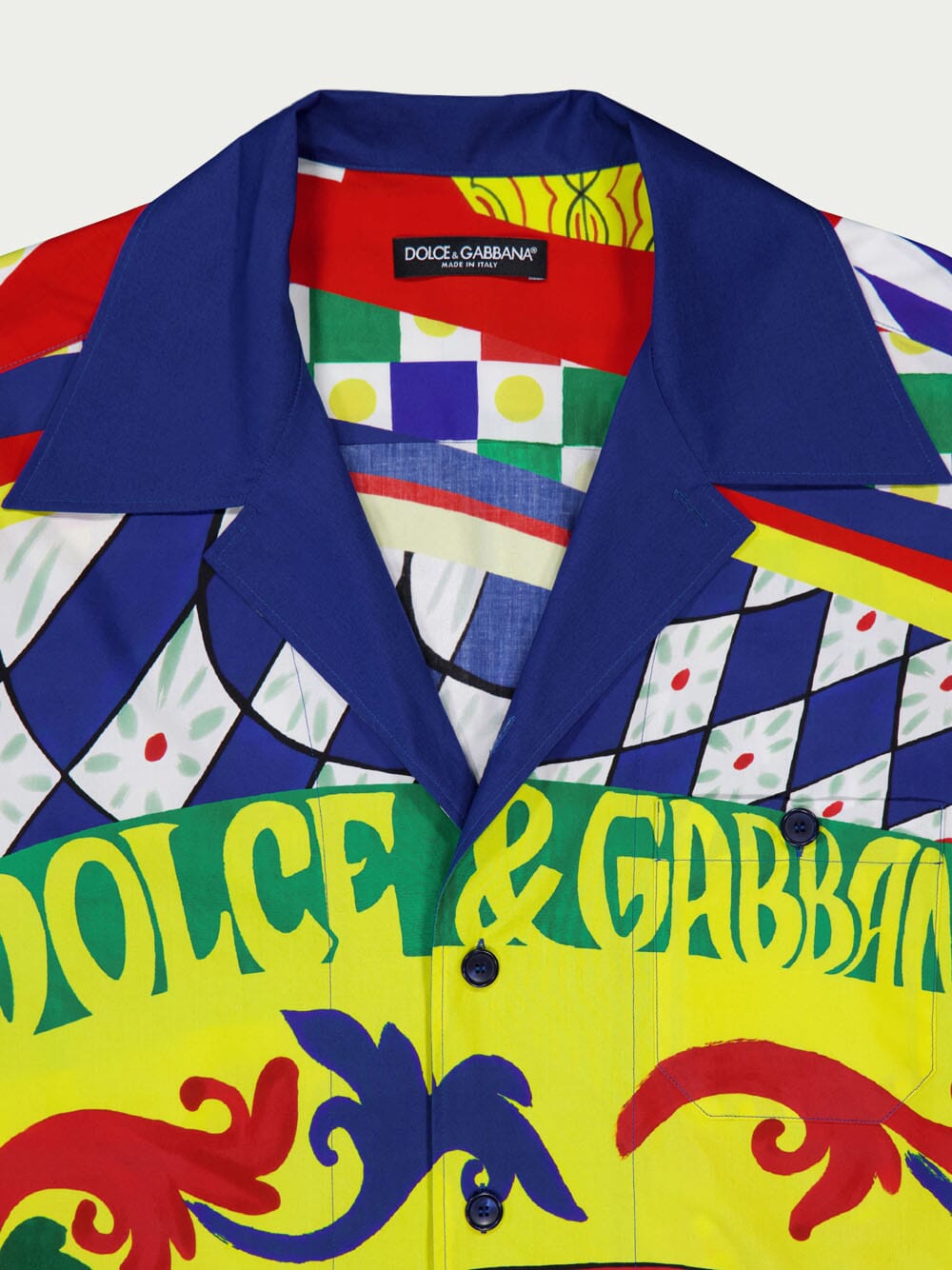 Carretto-Print Cotton Shirt, adorned with a vibrant Sicilian carretto print. Experience style and comfort with a notched collar and front button fastening, perfect for any occasion. Embrace the summer vibe with short sleeves, while the straight hem adds a touch of elegance.