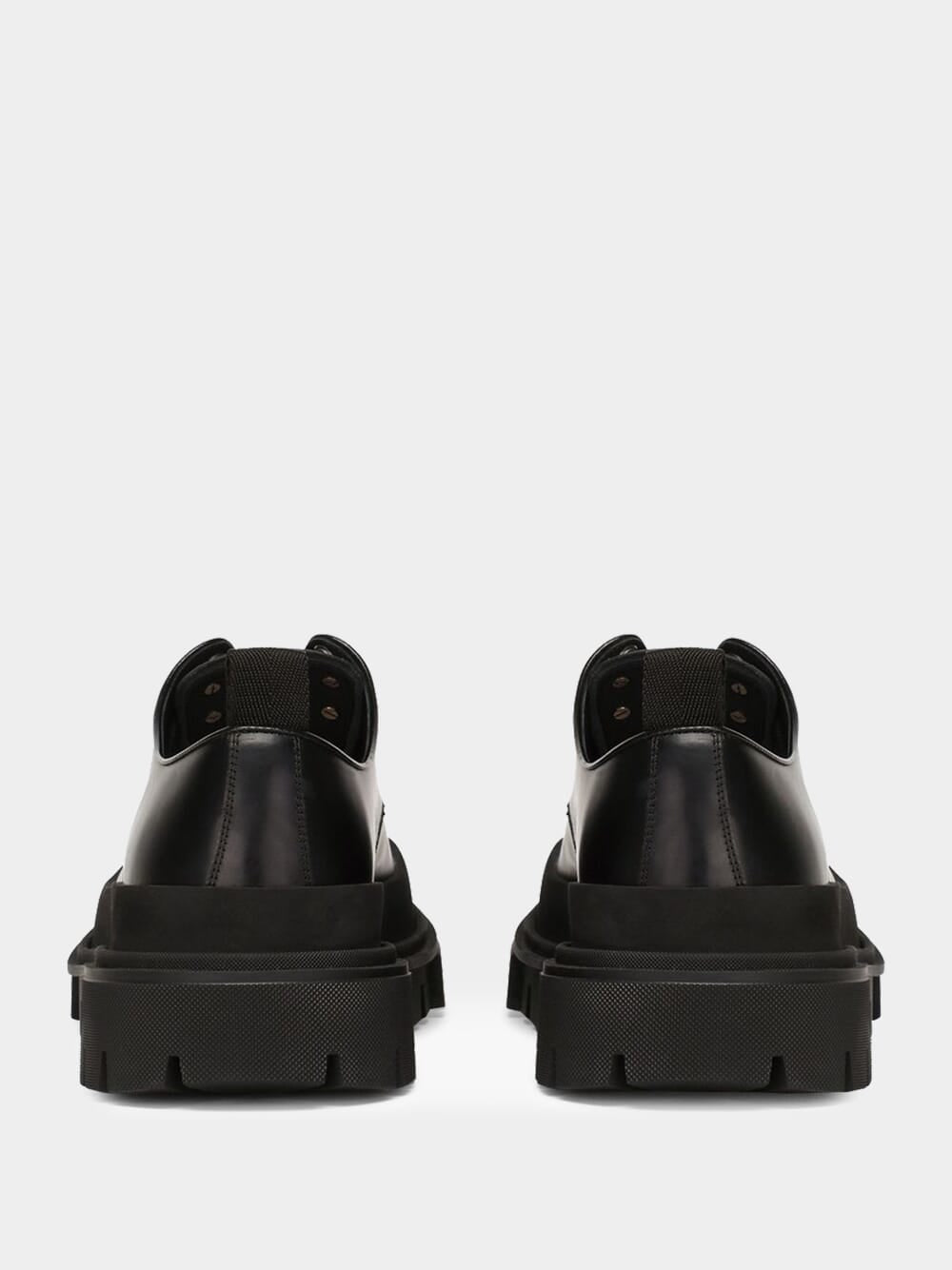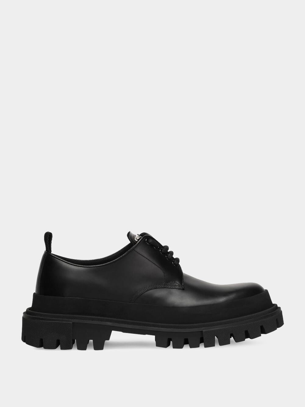 Dolce & Gabbana black rubberized leather derby shoes with waxed tubular laces inserted in the rubber sole.