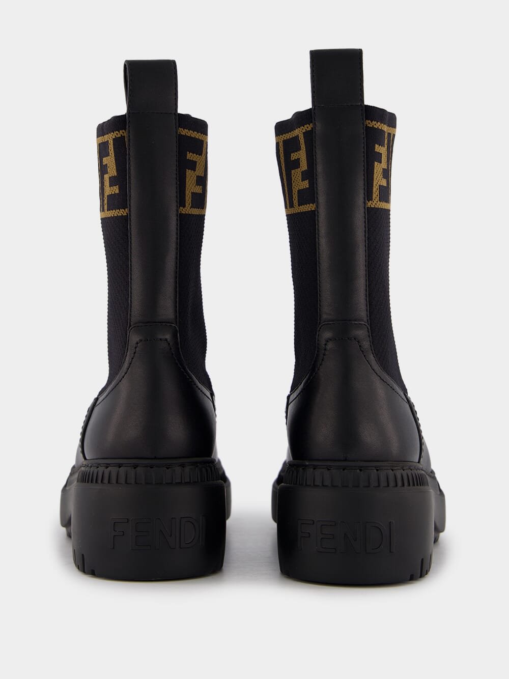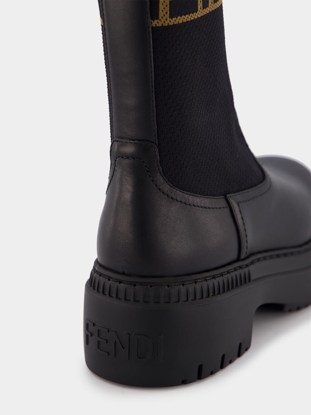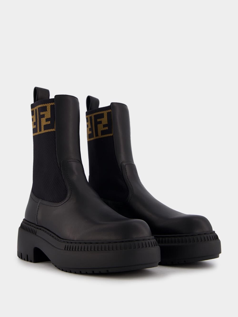 Domino Leather Biker Boots – a perfect blend of rugged charm and contemporary flair. Crafted from sleek black leather, these boots feature elastic inserts for a snug fit and round toes for a classic touch. The robust lug sole in rubber ensures durability and stability on any terrain. Elevate your fashion game with the distinctive FF motif on the instep, making these boots a statement piece for the modern trendsetter.