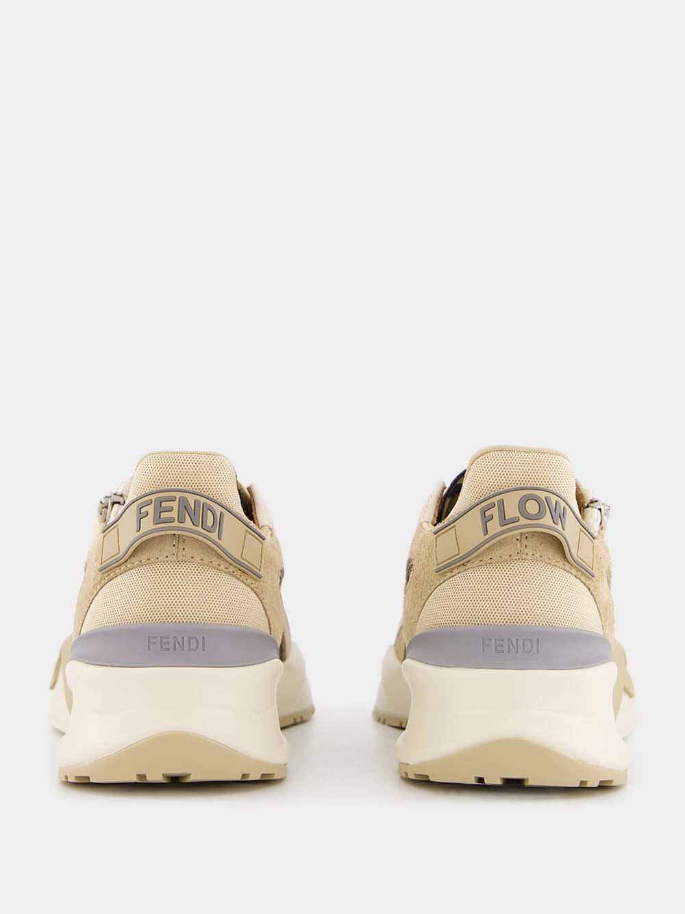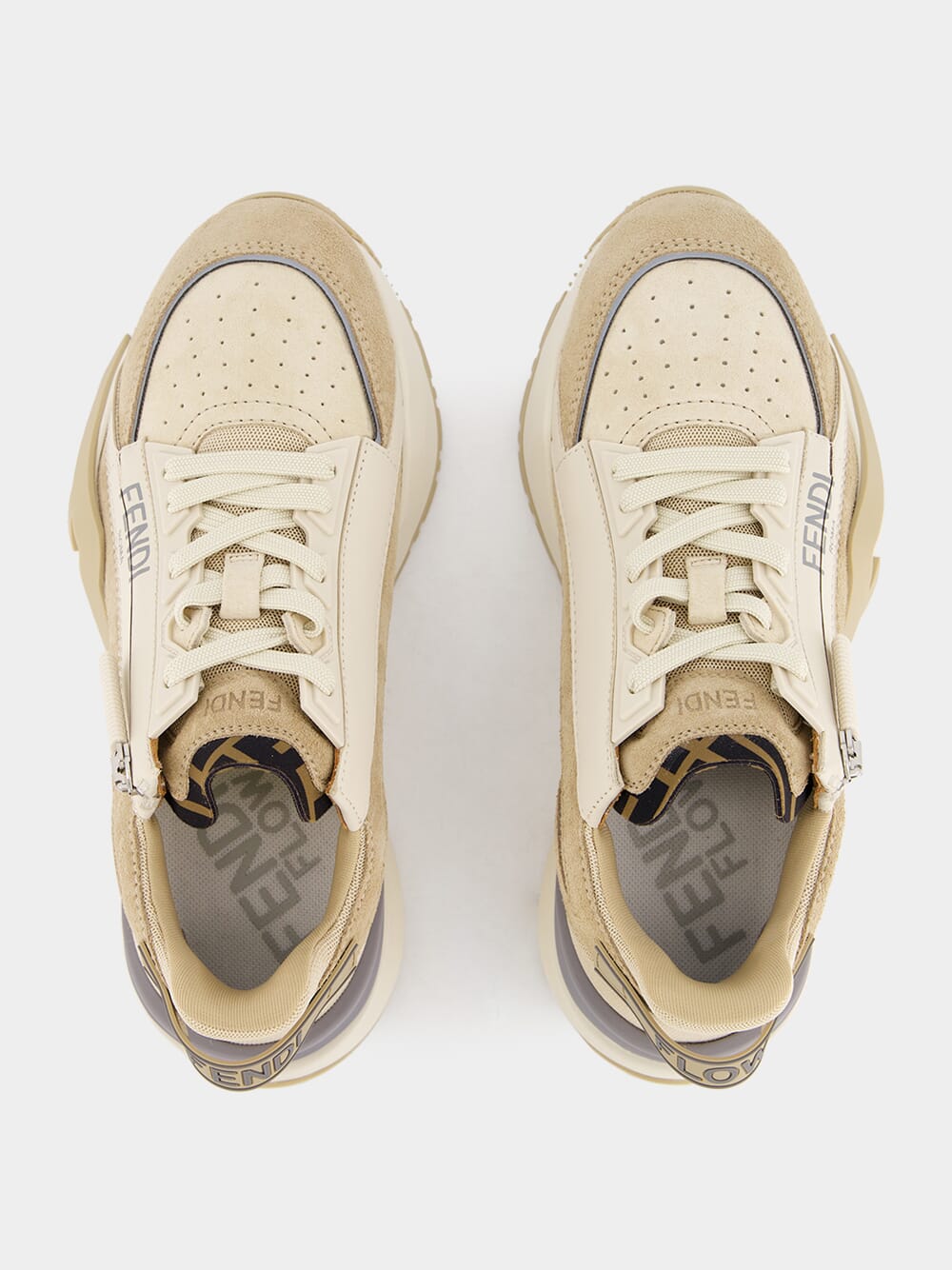 FF Strap Suede Sabots, a seamless fusion of style and comfort. These slip-on sneakers feature elasticated laces, a side zip, and a corrugated sole with engraved F. Fendi Flow lettering on the heels. Crafted from beige suede with tech fabric inserts, they are embellished with Lycra® details showcasing the iconic FF motif. The lightweight white rubber soles with beige diagonal F detail add a modern edge.