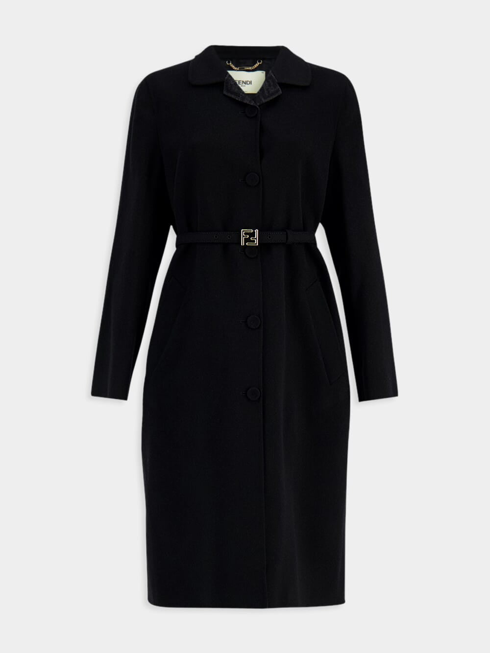 Single-breasted Midi Overcoat, a sophisticated blend of style and comfort. Crafted from premium lightweight double-sided black wool fabric, this midi coat features a rounded shirt collar, set-in sleeves, and slanted pockets for a timeless look. The coat fastens with covered buttons and a thin matching belt at the waist, complete with a metal FF buckle. Inside, the lining is customised with a grey FF motif, adding a touch of luxury to your ensemble.