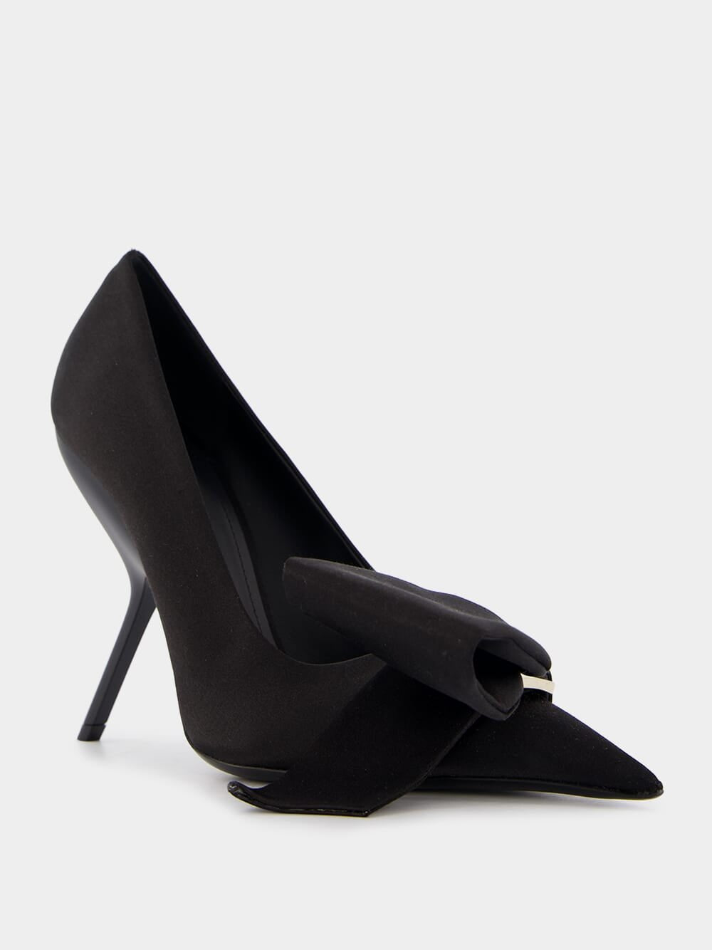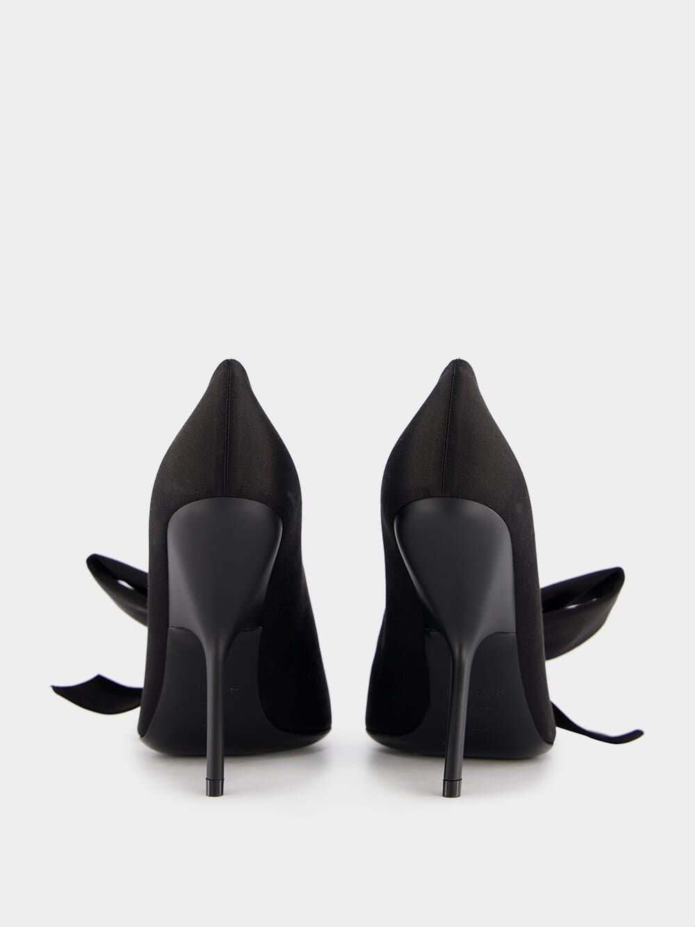 Adorned with a chic maxi-bow and a sleek metal buckle featuring our engraved logo, these glossy satin pumps boast a responsibly-crafted upper using 72% viscose and 28% silk. The slim, shaped heel with a painted tonal finish adds a touch of sophistication. Embrace eco-conscious fashion with leather soles meeting strict environmental standards and 100% post-consumer recycled polyester sewing thread.