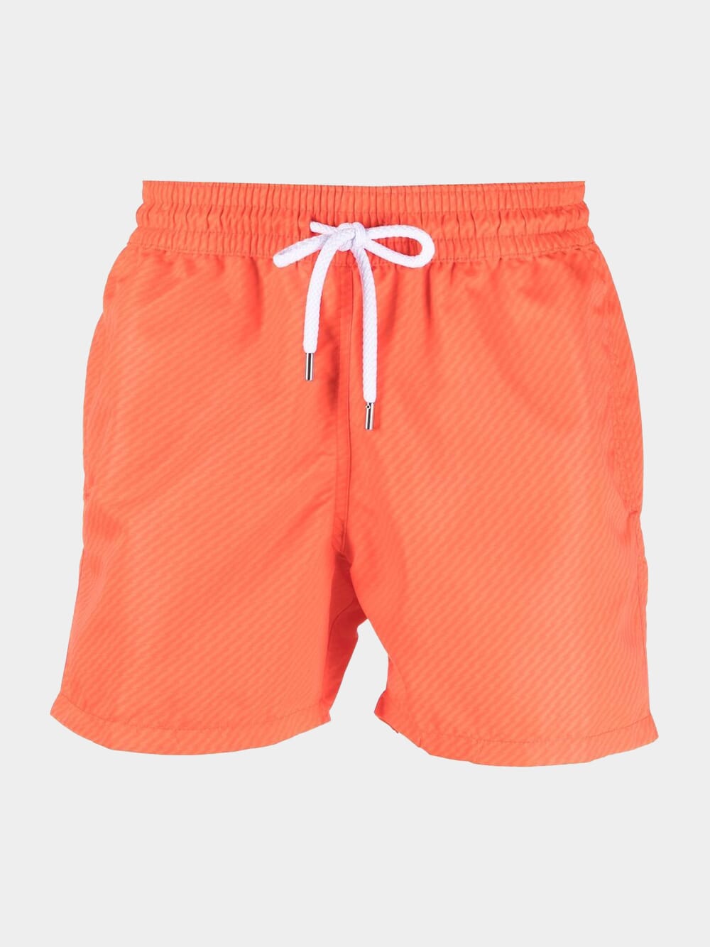 Frescobol Carioca orange short length swim shorts with pepe print, drawstring waist and back pocket.