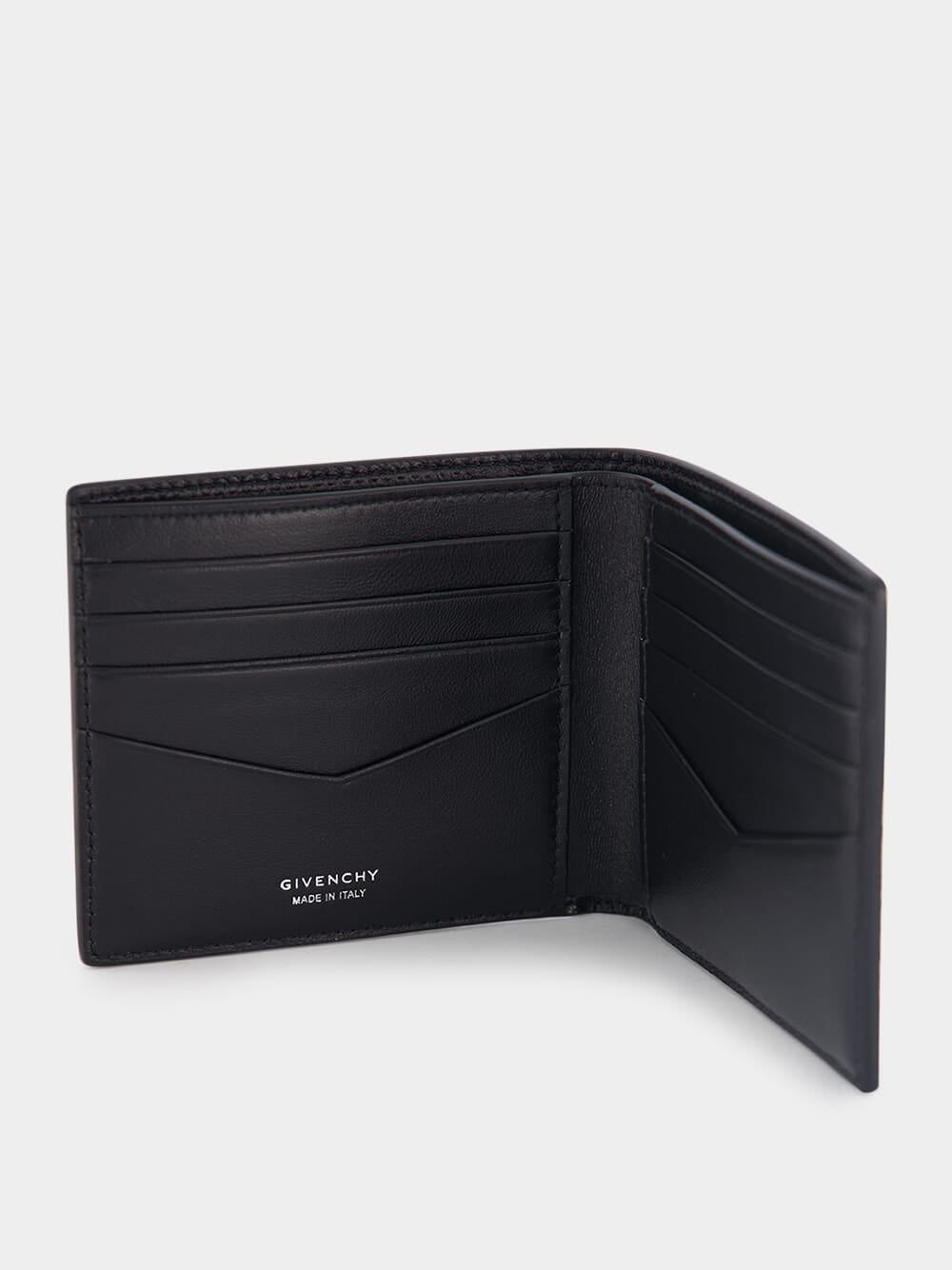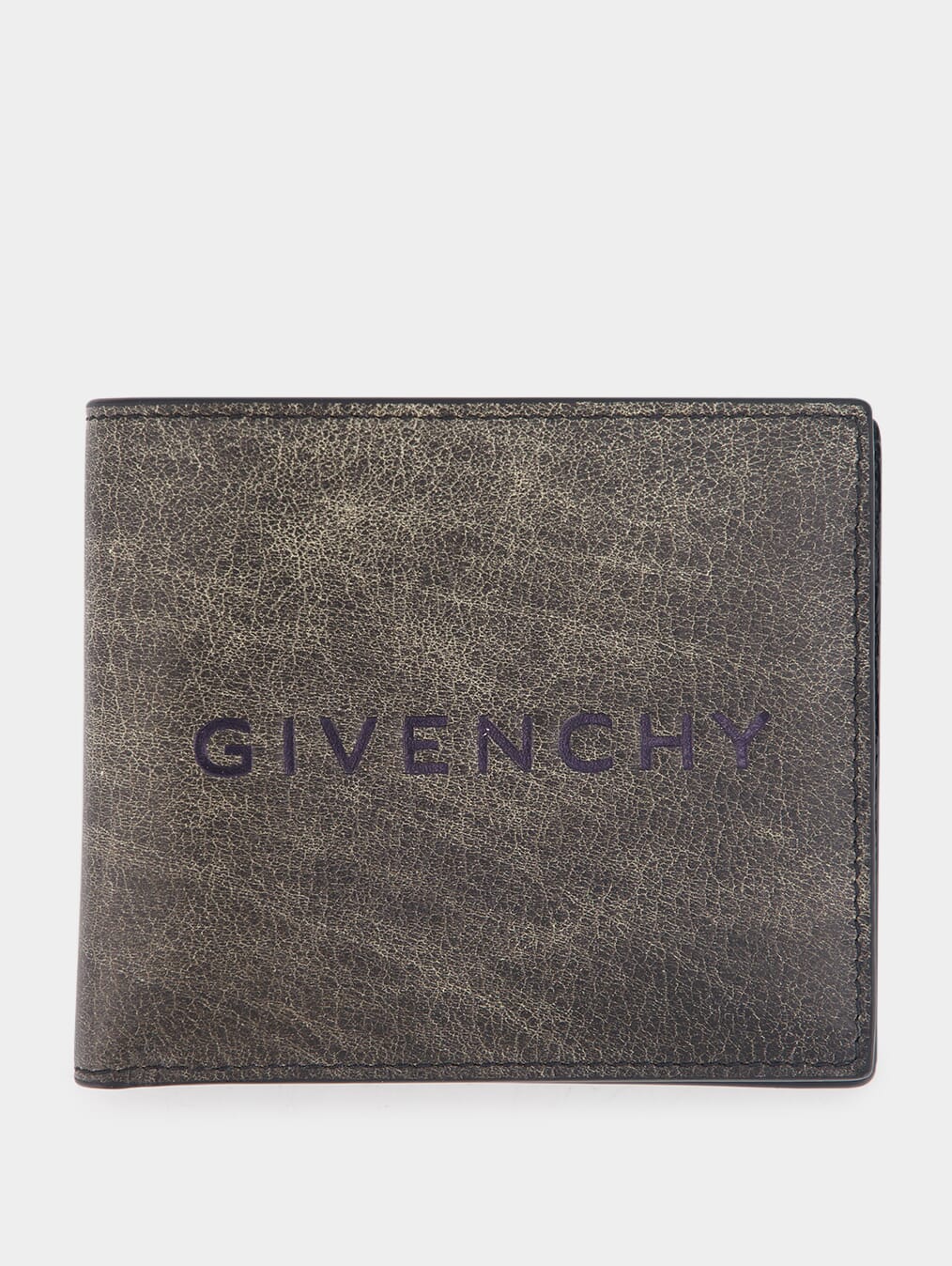 Embossed Logo Wallet in Crackled Leather. This bifold wallet is expertly crafted from exquisite vintage bull leather with a distinctive crackled texture. The iconic GIVENCHY signature is elegantly embossed on the front, while a silvery GIVENCHY signature is debossed on the inside. With two bill pockets and eight card slots, it offers both style and functionality.