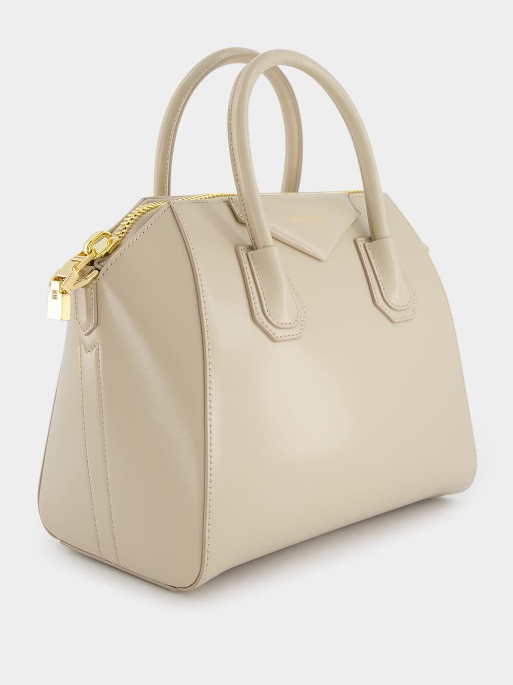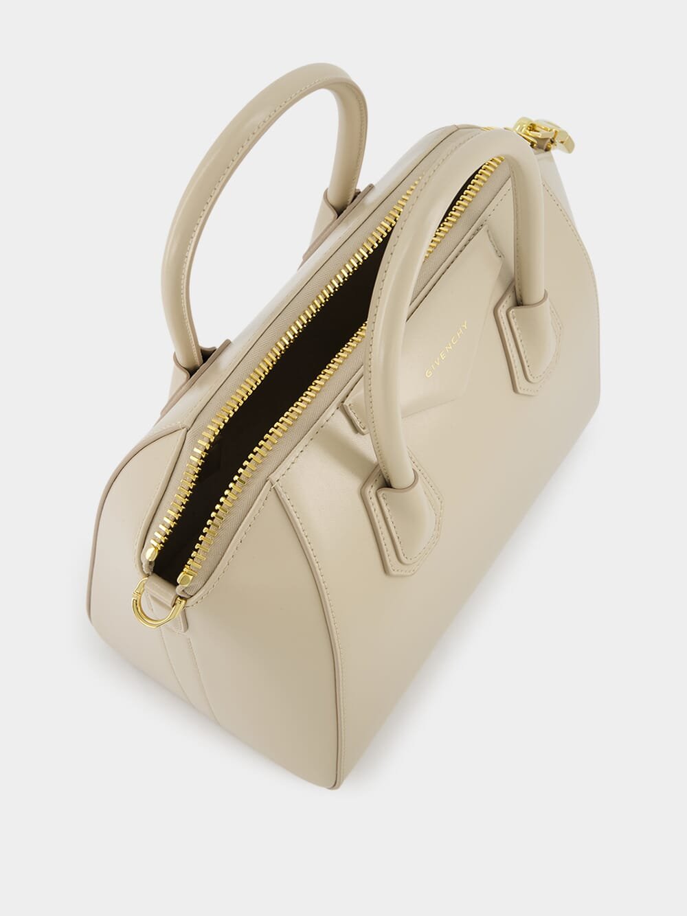 Small Antigona Bag by Givenchy, re-imagined in a sleek and stretchy silhouette. Made in Italy from polished leather, this trapeze-style shoulder bag boasts an embossed padlock, adding a touch of sophistication. With top handles and a removable strap, it offers both versatility and style.