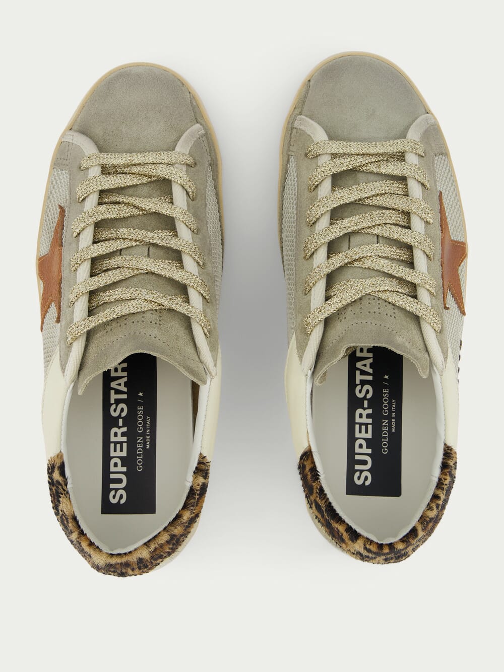 Super-Star Mixed-Media Sneakers, feature a trendy leopard print. The star patch detail and contrasting panel detail add a touch of edgy flair. Embrace elegance with the contrasting branded heel counter and experience all-day comfort with the round toe and front lace-up fastening.
