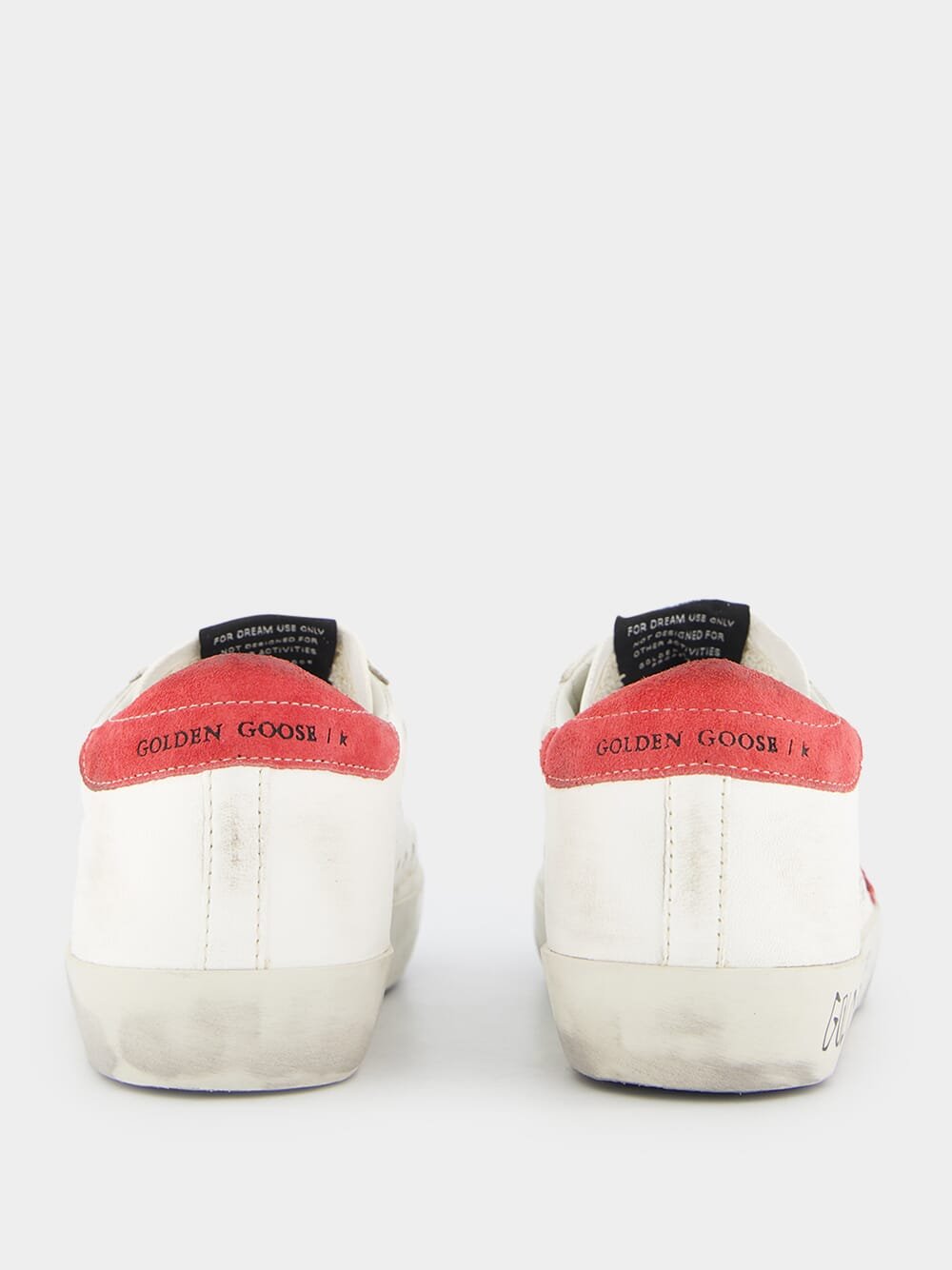 Superstar Low-Top Sneakers, showcasing a white nappa leather upper that exudes luxury and sophistication. Stand out with a vibrant red leather star and a matching red leather heel tab, adding a bold and distinctive touch to this iconic pair.