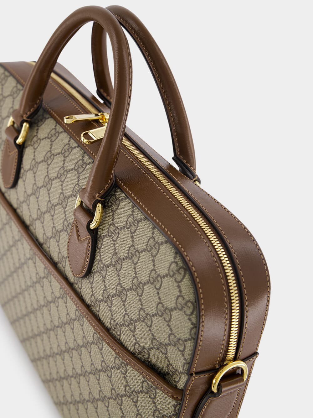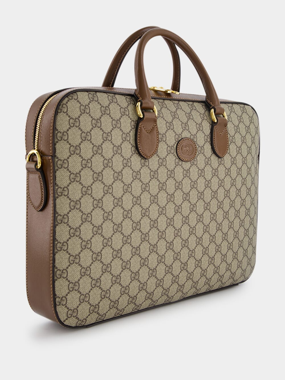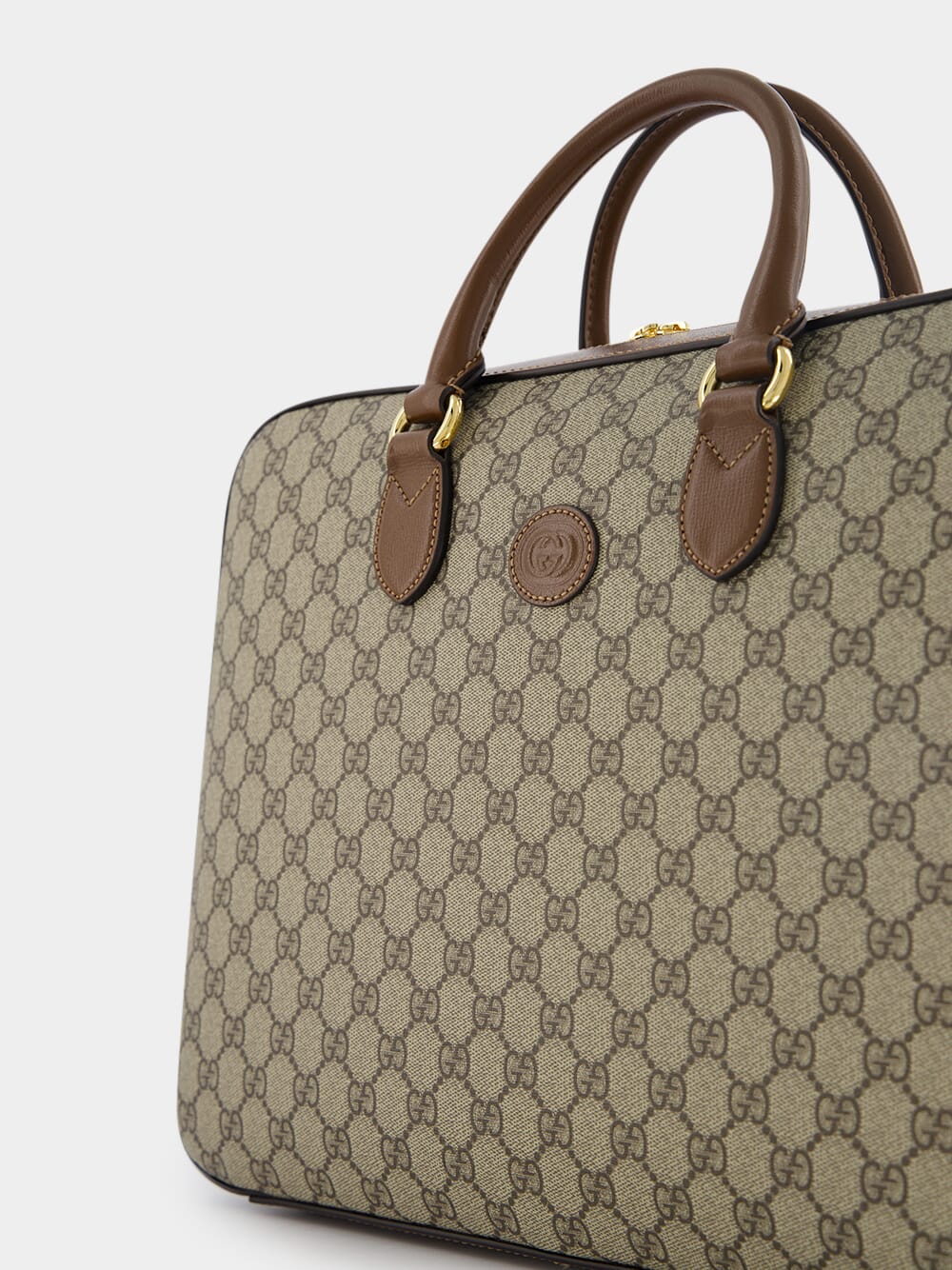Business Case With Interlocking G, crafted with a captivating blend of beige and ebony GG Supreme canvas, exuding timeless elegance. The brown leather details enhance its refined appeal, while the cotton linen lining adds a touch of luxury. Adorned with an oval leather Interlocking G tag, this case exudes unmistakable style. Inside, you'll find a zip pocket, padded laptop compartment, and a leather open pocket with 3 card slots for organized convenience.