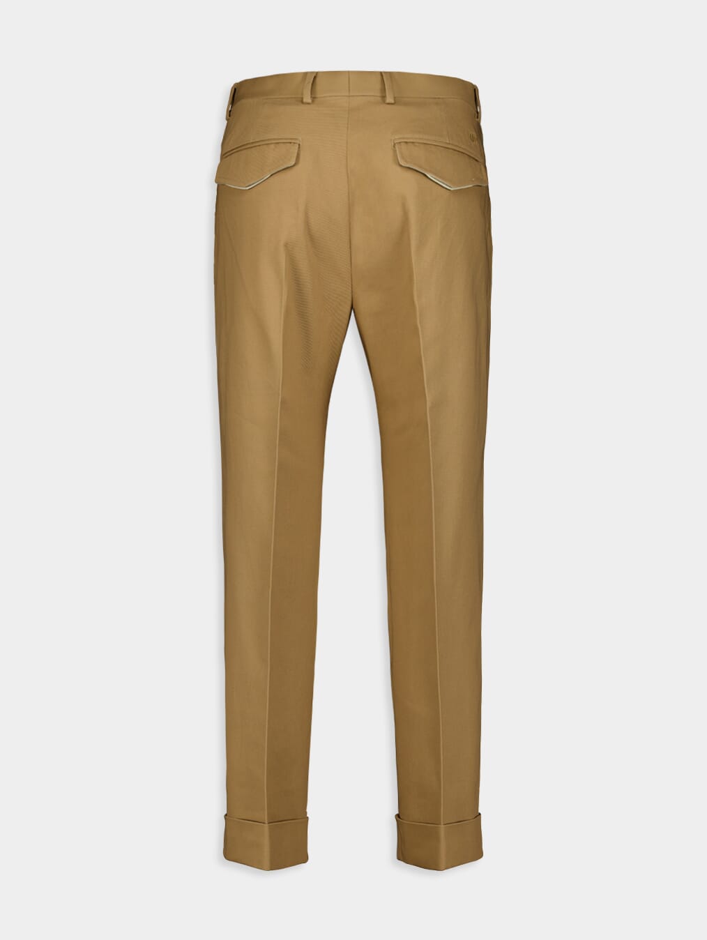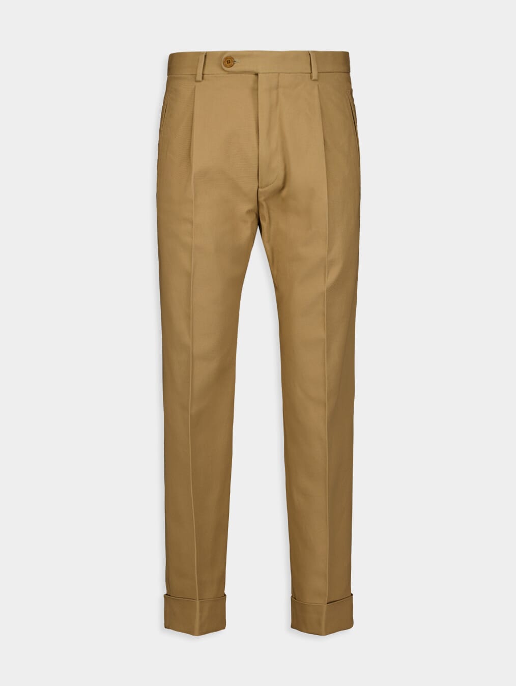 Cotton Drill Trousers, expertly crafted with a focus on style and comfort. These trousers feature a distinctive Double G embroidery on the back, adding a touch of luxury to your look. With belt loops, front side pockets, and back pockets, they offer both fashion and practicality. The pleated details add a fashionable twist, and the button and zip closure ensure a secure fit. Complete with a turn-up hem, these trousers are a versatile addition to your collection.