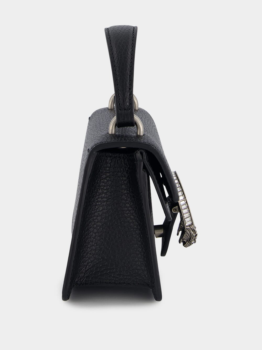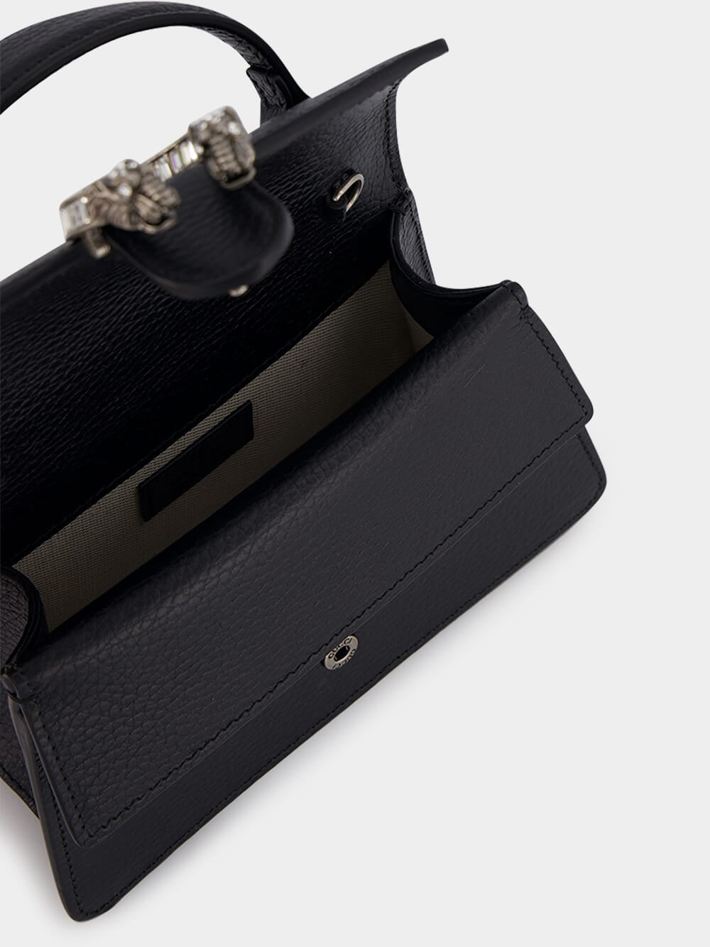 Dionysus Mini Top Handle Bag, adorned with crystal hardware, this bag exudes a sense of opulence and sophistication. The cotton linen lining offers durability and a sustainable choice. The iconic Tiger head closure adds a touch of fierce elegance, showcasing the brand's unique design aesthetic. The external pocket under the flap provides convenient storage options. The top handle adds a classic and elegant carrying option, while the chain shoulder strap offers versatility and a modern edge. Securing your belongings is made easy with the magnetic button closure, ensuring both style and functionality.