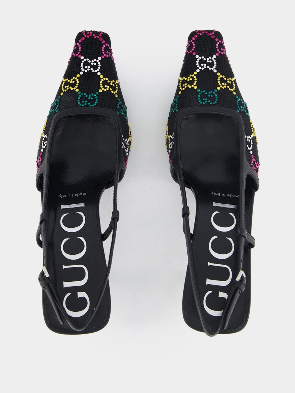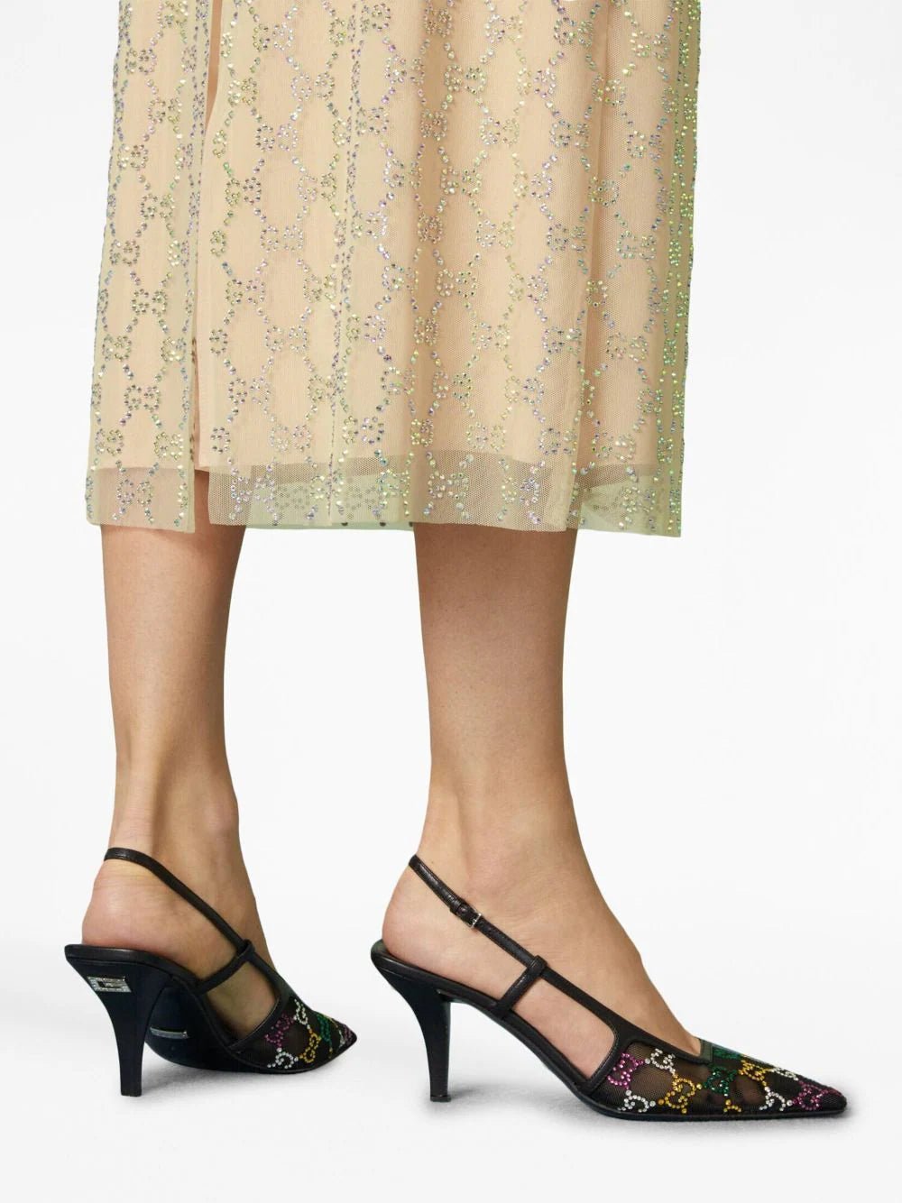GG Crystal-Embellished Mesh 75mm Pumps. These pumps blend elegance and contemporary style with exquisite mesh detailing and leather trim. The signature Double G logo and dazzling glass crystal embellishment add a touch of opulence to your ensemble. With a pointed toe and buckle-fastening slingback strap for a secure fit, these pumps offer both comfort and sophistication.