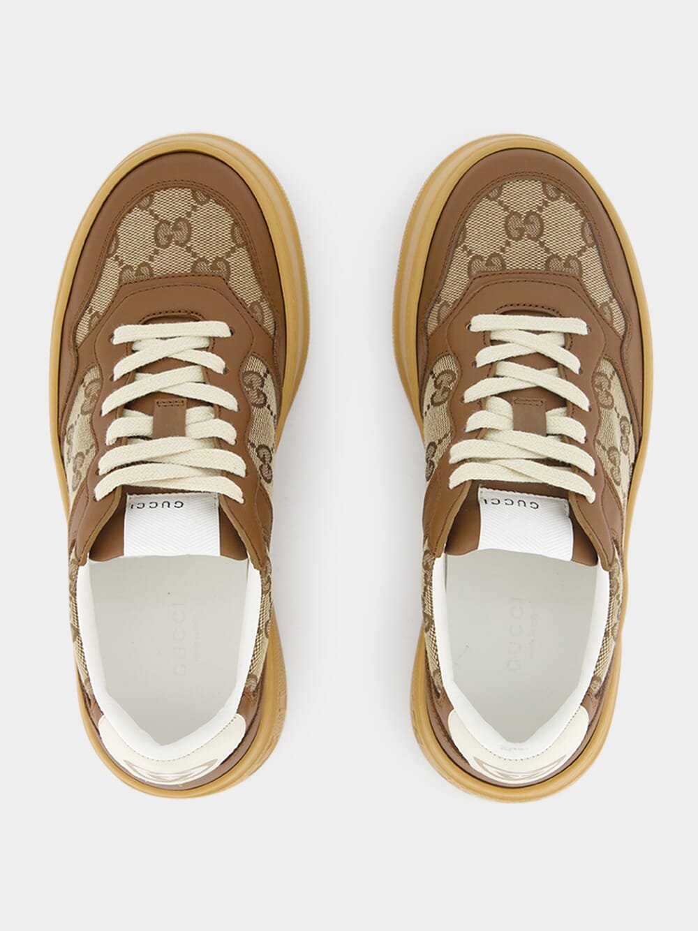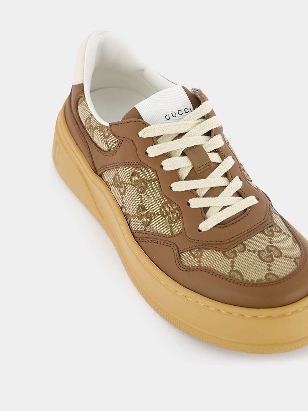 GG Embossed Low-Top Sneakers, crafted with high-quality materials, these sneakers feature an elegant brown leather trim, adding a touch of sophistication and refinement. The lace-up closure ensures a secure and adjustable fit, while the rubber sole provides traction and durability. Each pair of sneakers also comes with an additional set of laces, allowing for customization and style options. With a flat design, these sneakers offer a comfortable and versatile style suitable for various occasions.