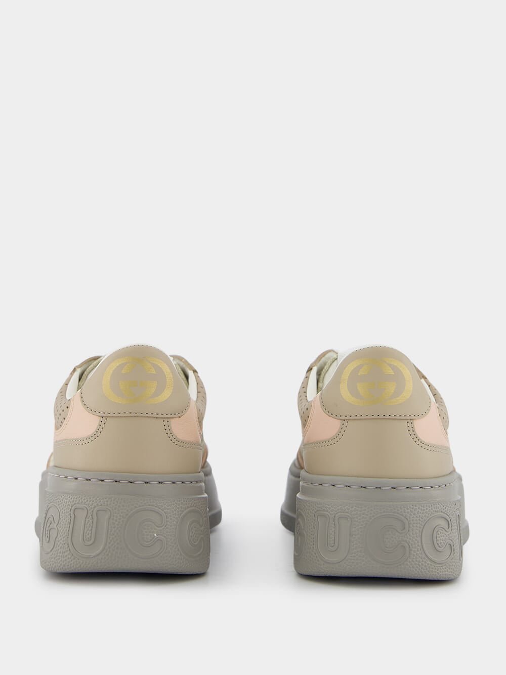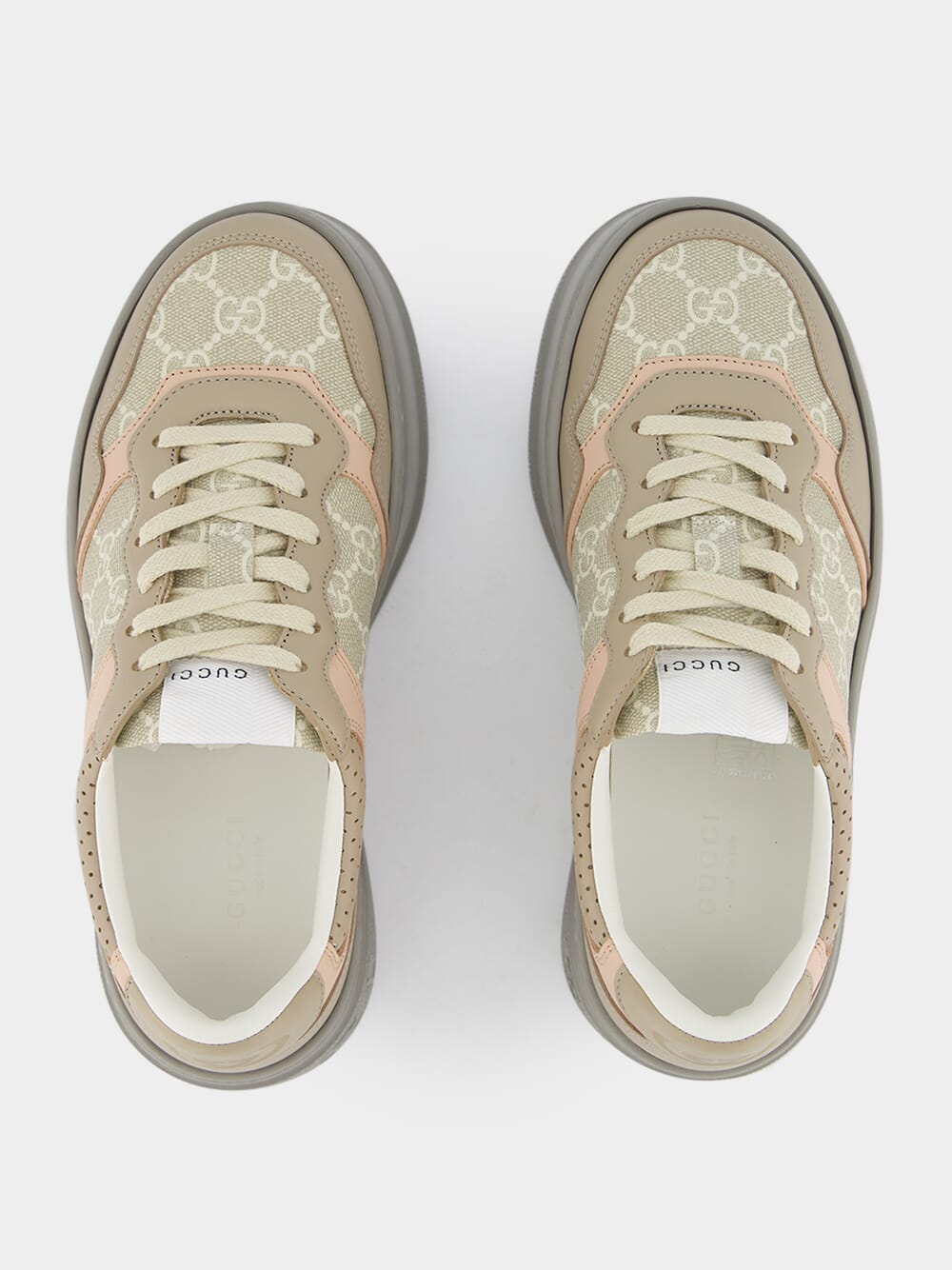 GG Panelled Low-Top Sneakers, crafted with classic GG canvas and leather trim, these sneakers showcase a chic and timeless design. The panelled design and round toe add a touch of sophistication. Enjoy a secure fit with the front lace-up fastening and experience added height with the platform sole. Women's Gucci sneakers fit large, so for the most comfortable fit, we recommend selecting half a size down.