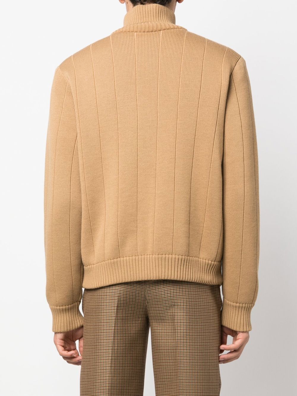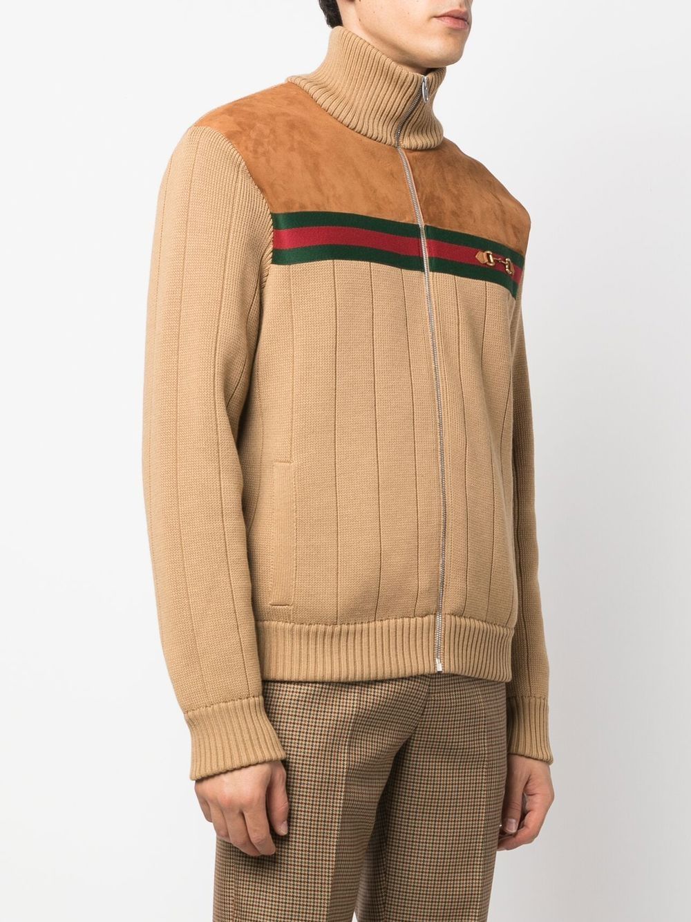 Gucci camel wool knitted and ribbed bomber jacket with brown suede band and green and red Web detail.