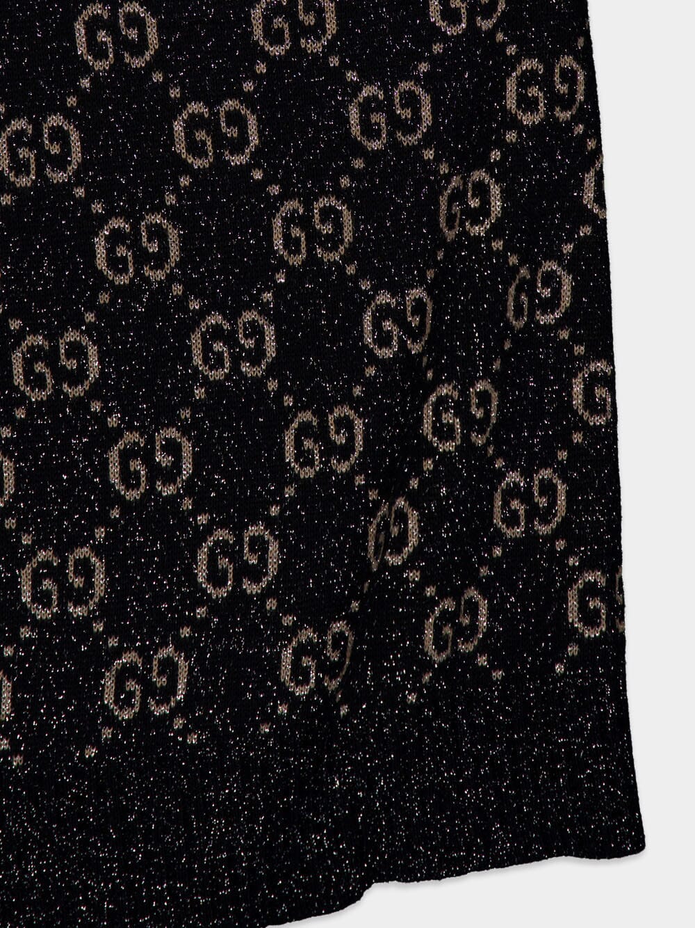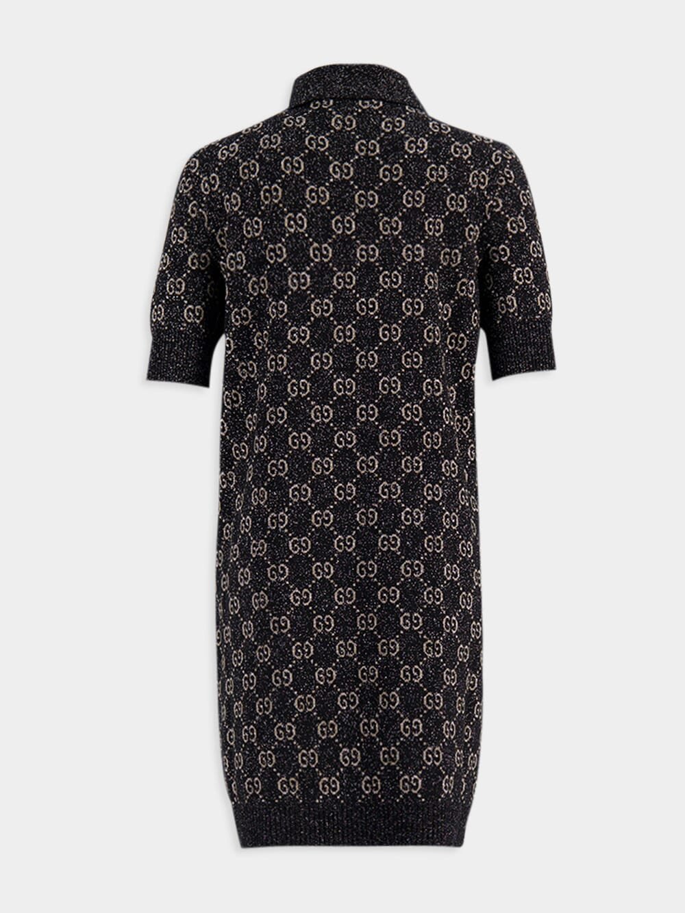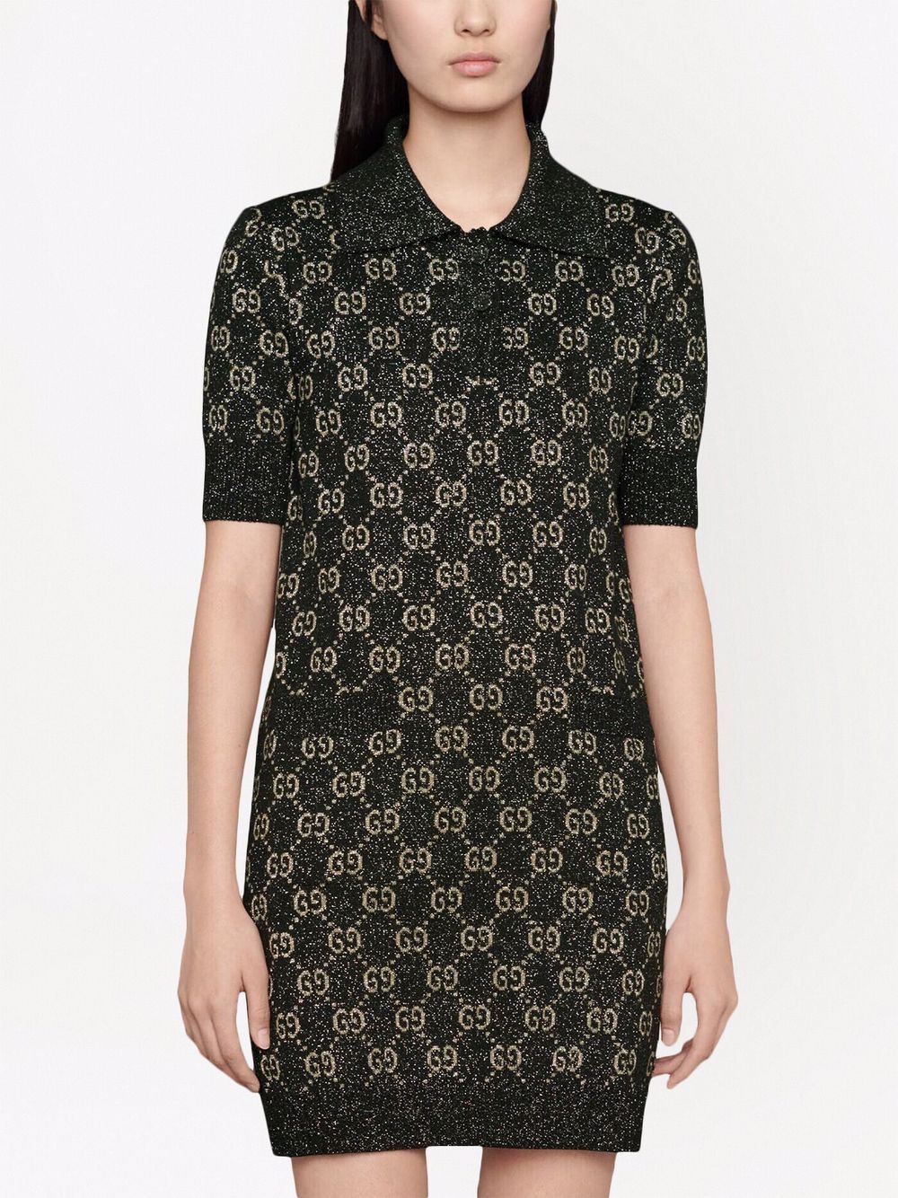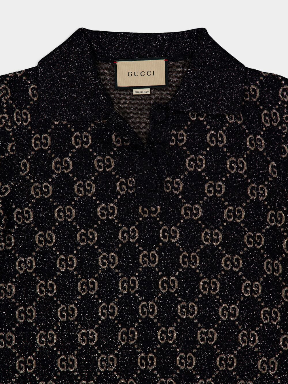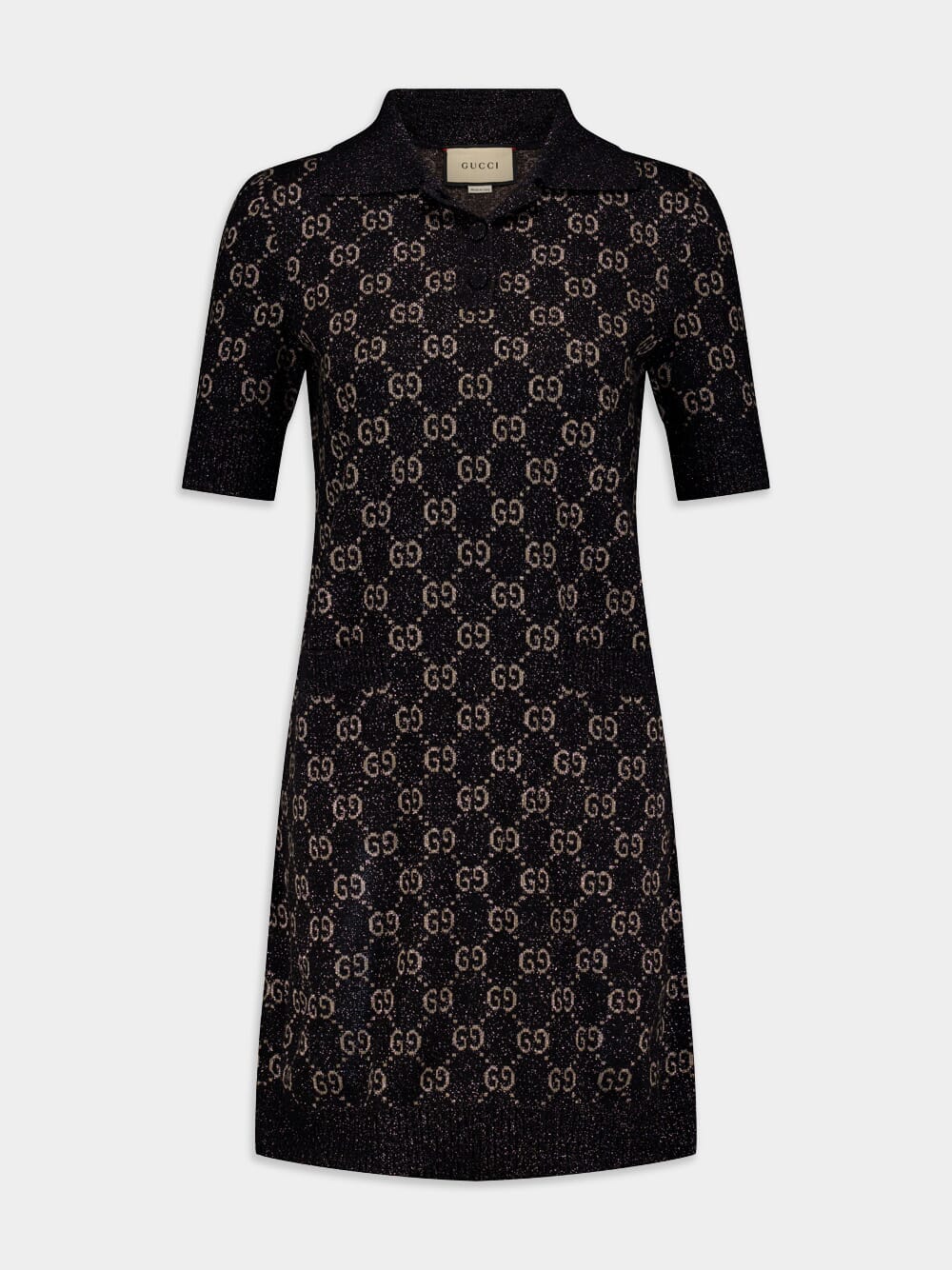 Gucci black and beige fine cotton lamé GG jacquard midi dress with polo collar, short sleeves and ribbed details.