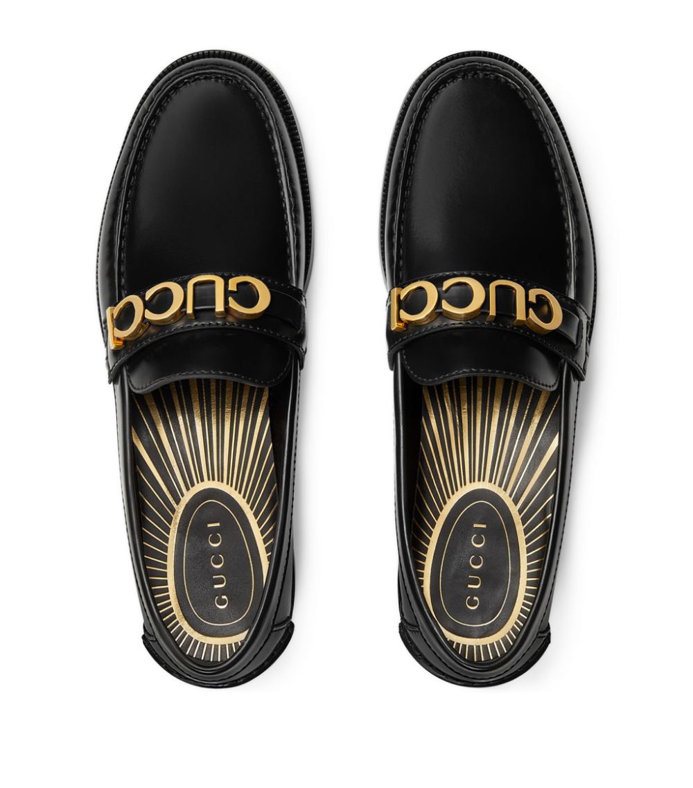 Gucci men's loafers in black leather with Gold-toned hardware, metallic sun ray print on the insole and metal Gucci logo.