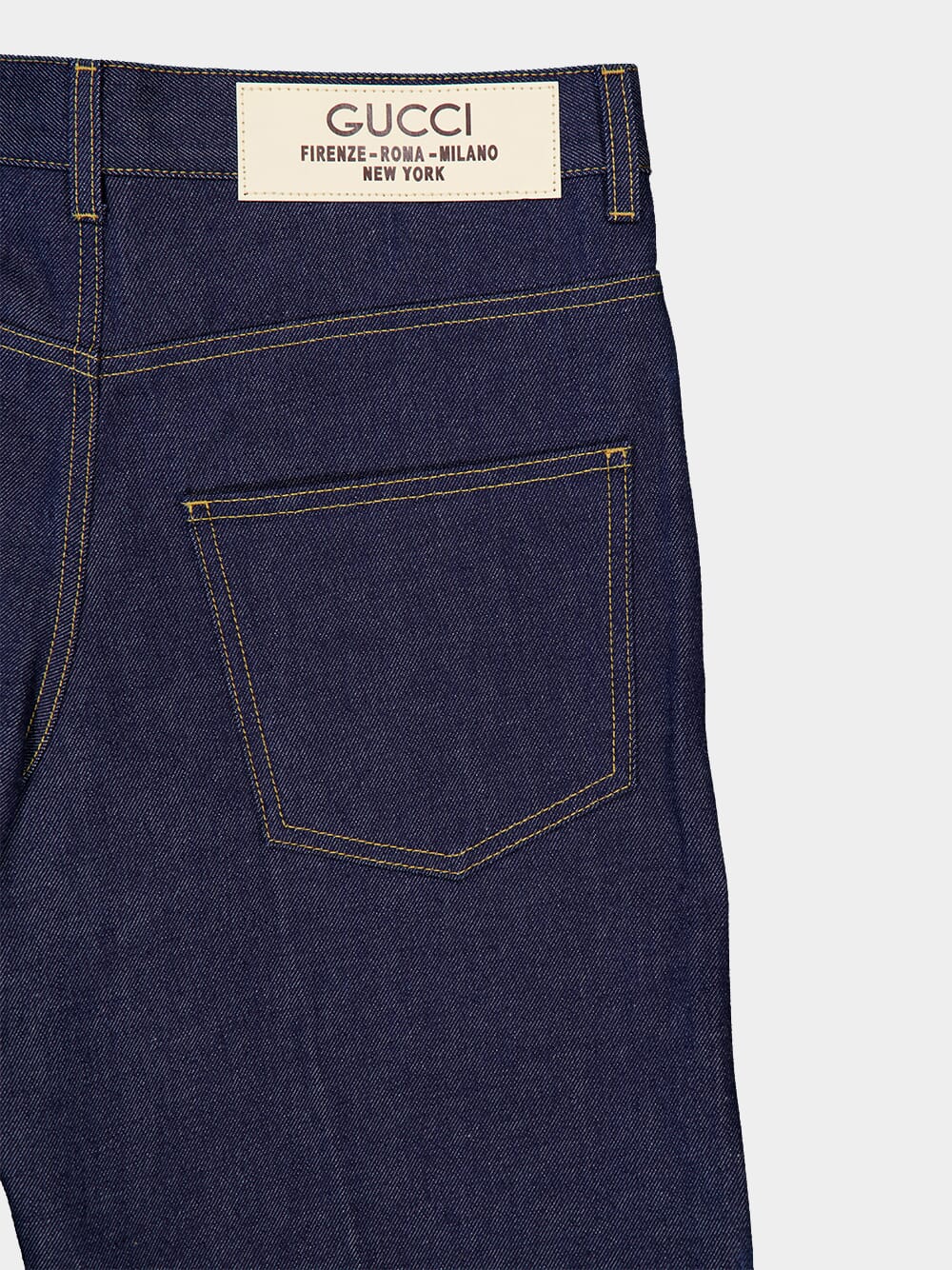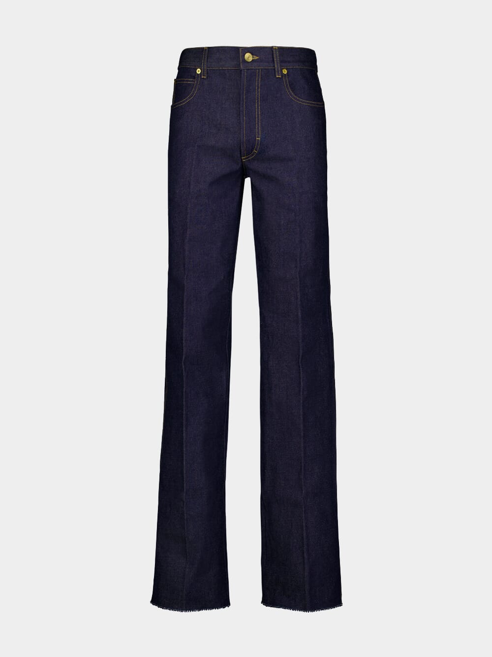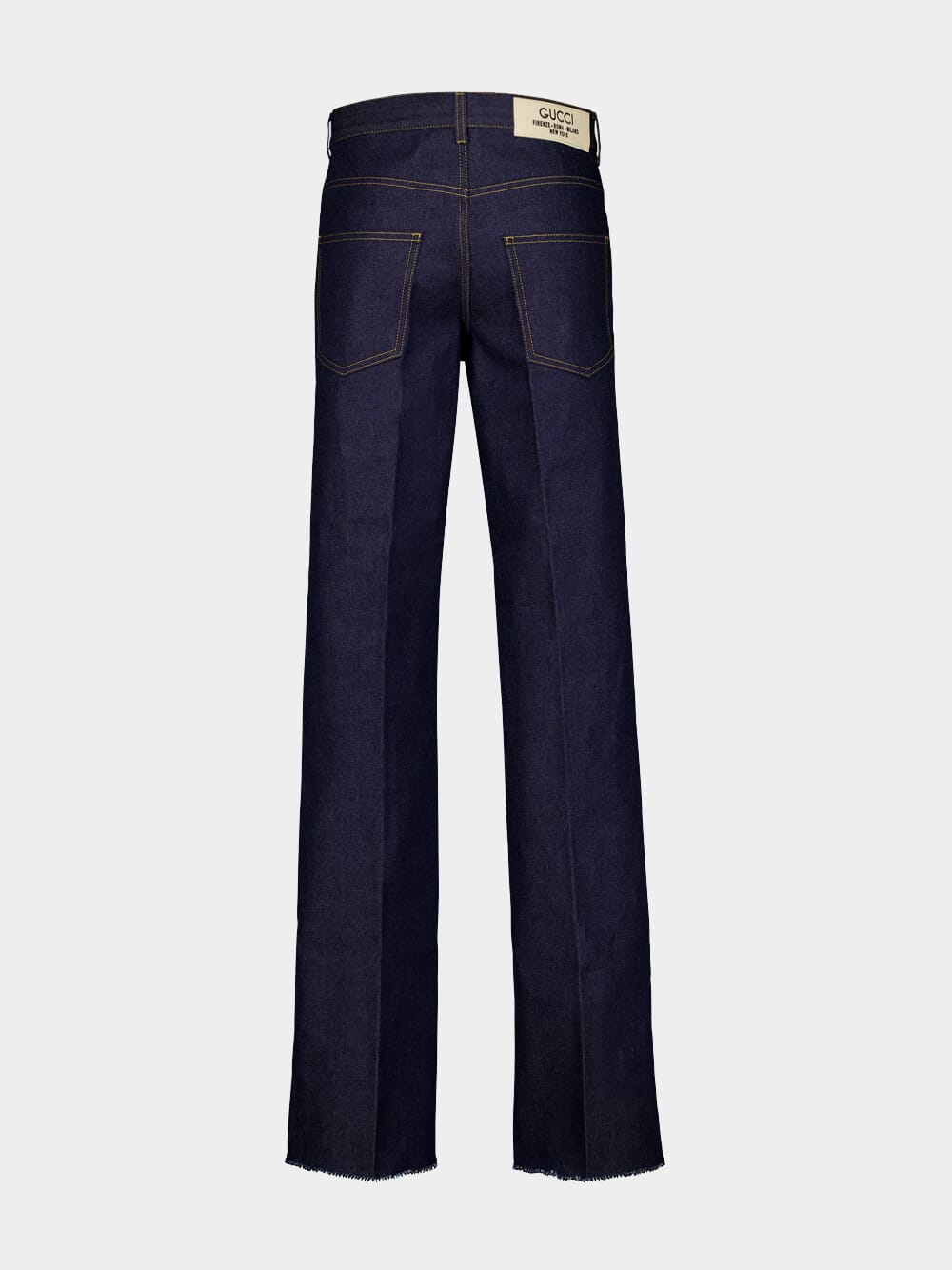 Mid-Rise Wide-Leg Jeans, crafted from premium dark wash denim for a timeless appeal. Complete with a distinctive logo patch on the rear, these jeans boast practical belt loops and a front button fastening. Embrace comfort and style with a mid-rise fit and wide leg design, accompanied by classic five pockets for added convenience.
