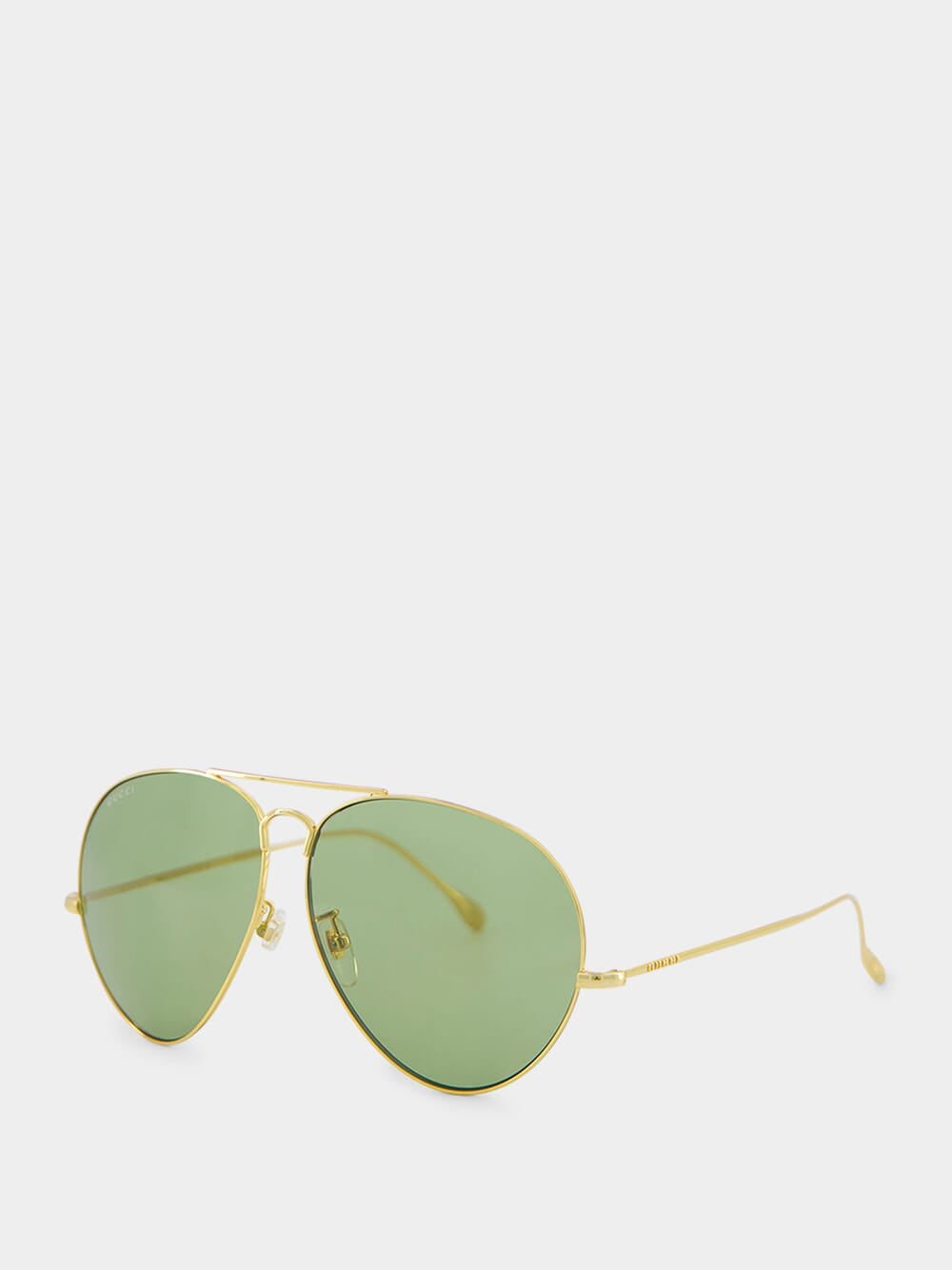 Rectangular Frame Sunglasses, a fusion of elegance and trend, boasting a shiny yellow gold-toned metal frame with a sleek top bar, perfectly capturing contemporary fashion. The temples, adorned with the iconic Gucci script, radiate luxury and sophistication. Paired with solid green lenses, these shades offer both a statement-making look and superior visual clarity.