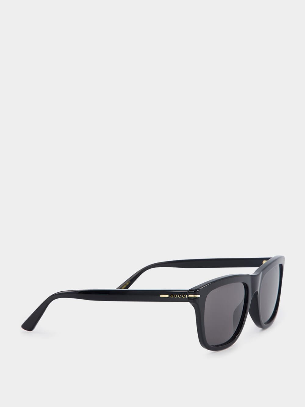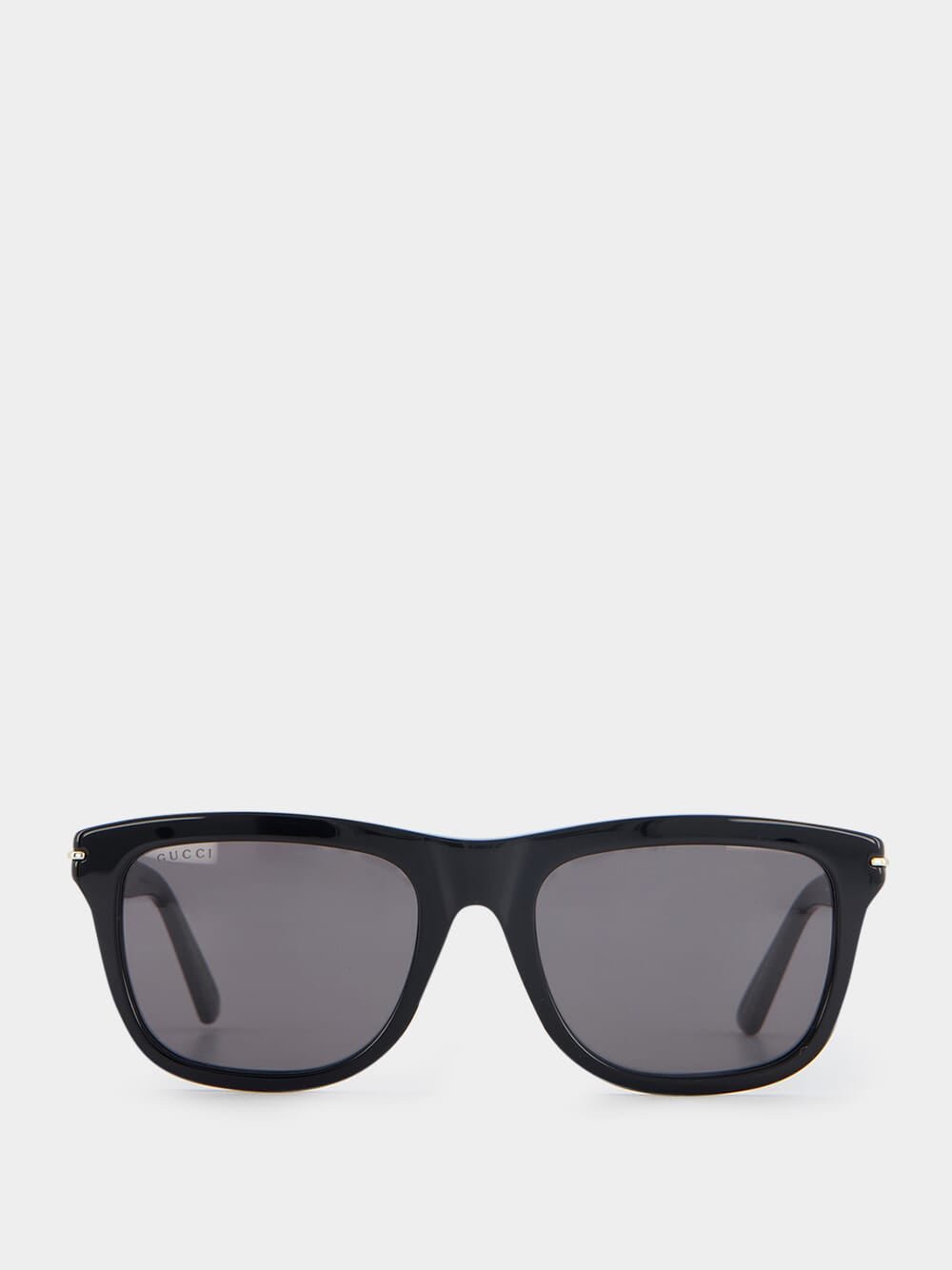 Rectangular Frame Sunglasses, featuring a shiny black acetate frame and temples adorned with Gucci lettering. The solid grey lens not only offers a stylish look but also provides 100% UVA/UVB protection, ensuring optimal eye safety. With their timeless design and superior quality, these sunglasses are perfect for any occasion.