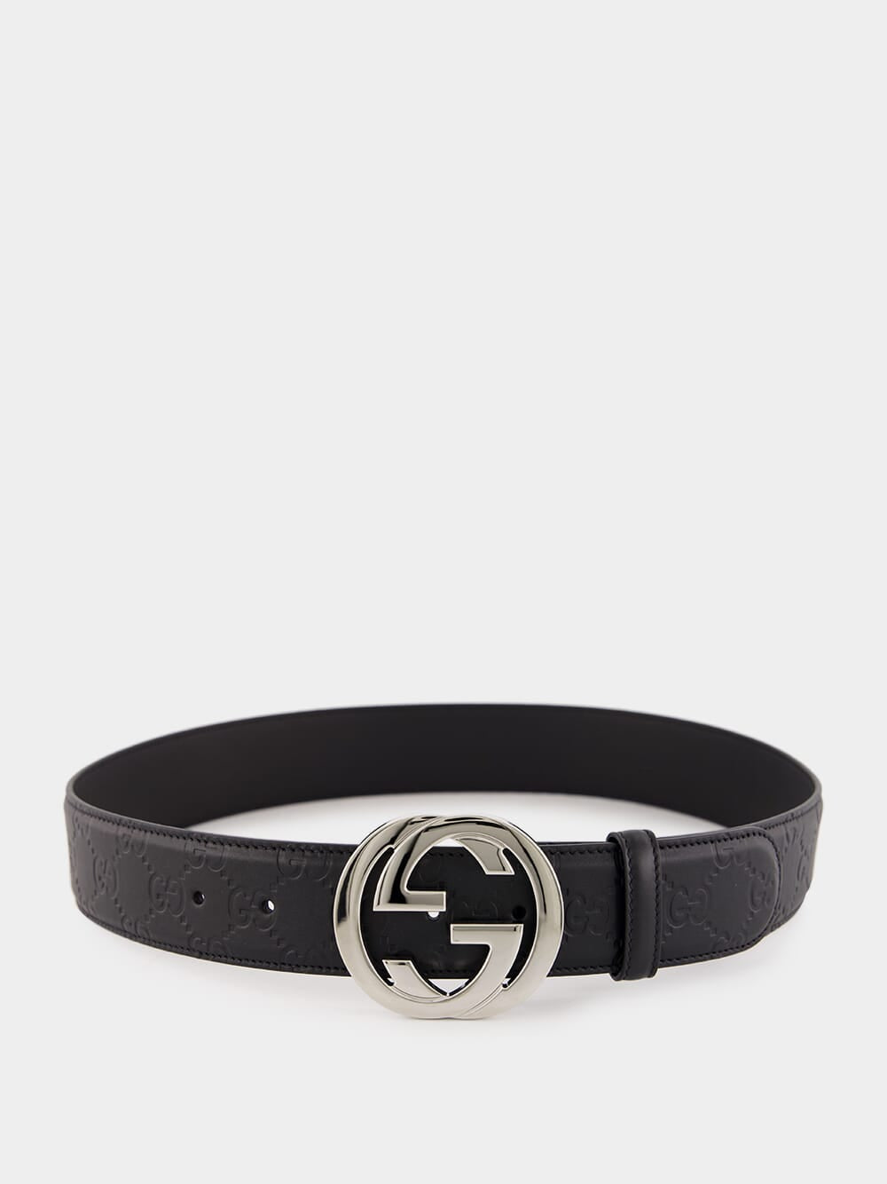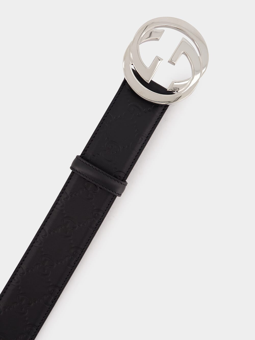 Gucci Signature black heat debossed leather belt with silver Interlocking G buckle.