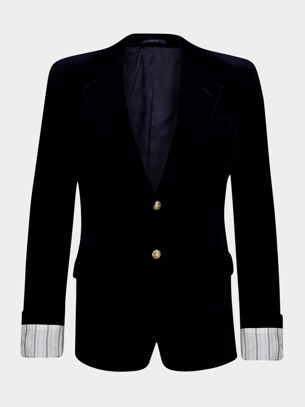 Stretch Cotton Velvet Formal Jacket, adorned with elegant gold-toned crest buttons, it boasts a fully lined interior for a luxurious feel. The single-breasted design features a full canvas construction and a classic notch lapel, ensuring a polished look. With a front chest pocket and spacious front pockets, this jacket adds both style and convenience.