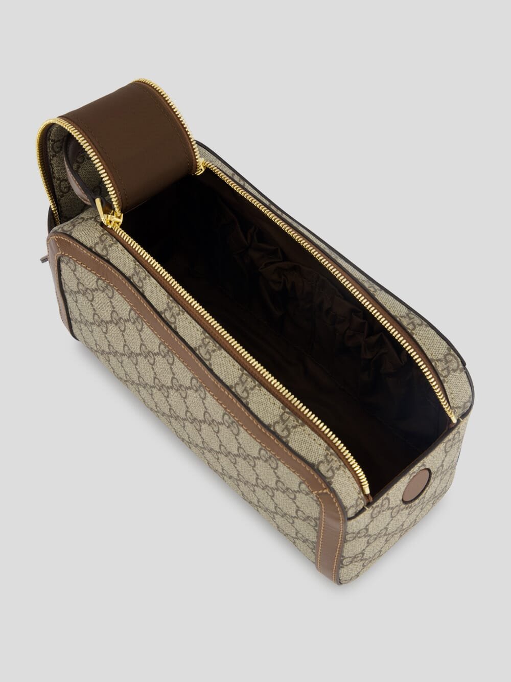 Toiletry Case with Interlocking G crafted from the iconic Beige and Ebony GG Supreme canvas with brown leather trim, this case exudes a timeless and sophisticated aesthetic. The oval shape and interlocking G leather tag showcase exquisite attention to detail. With its convenient outside handle, it offers easy carrying. The inside features an open compartment and zip closure, ensuring secure storage for your toiletries.