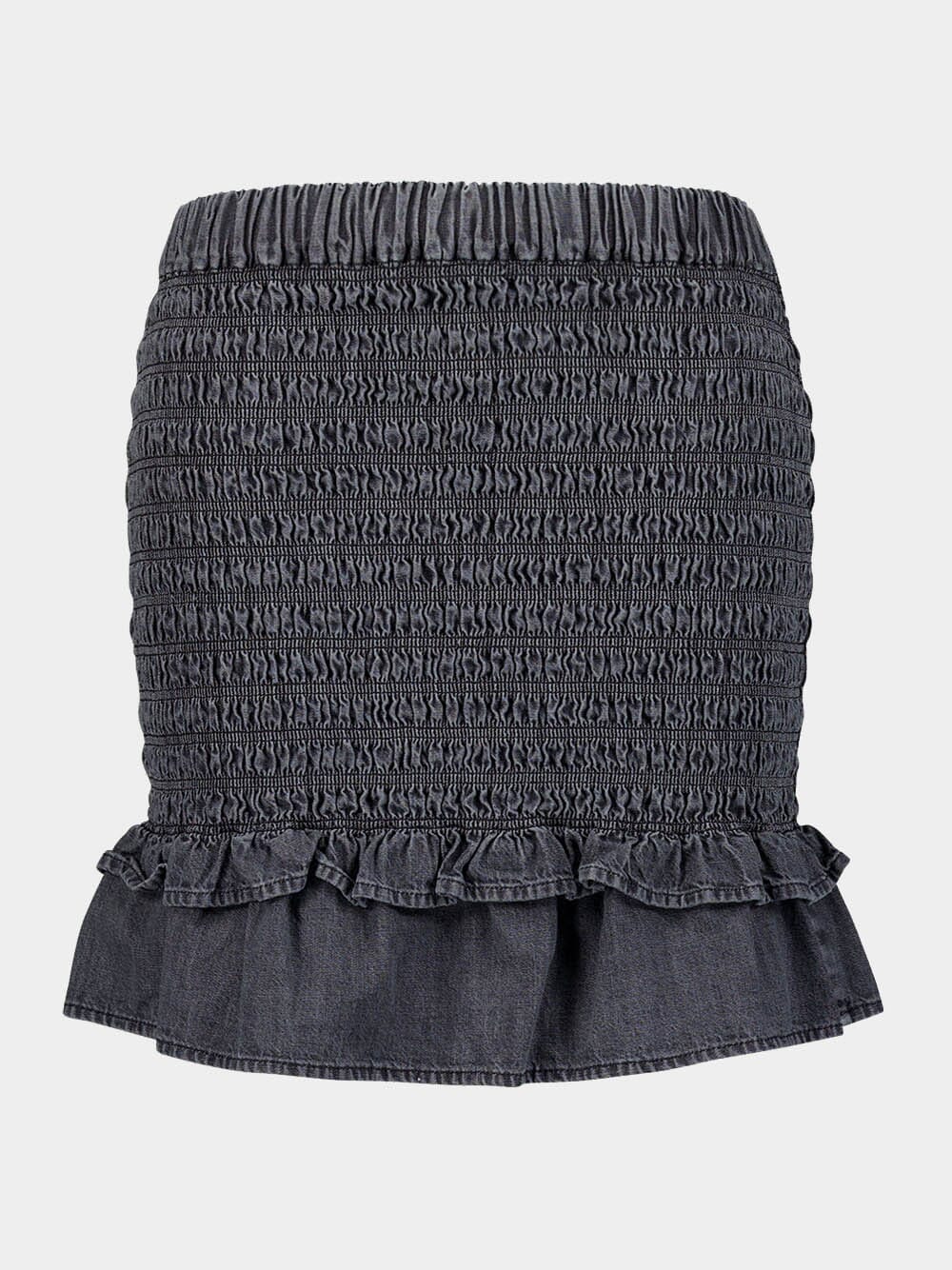 Dorela Cotton Denim Miniskirt, expertly crafted from comfortable cotton. This skirt features a shirred effect and an elasticated waistband, ensuring both a flattering fit and all-day comfort. The playful ruffle hem adds a touch of flair to its classic straight hem design. Embrace the thigh-length cut for a chic and trendy look.