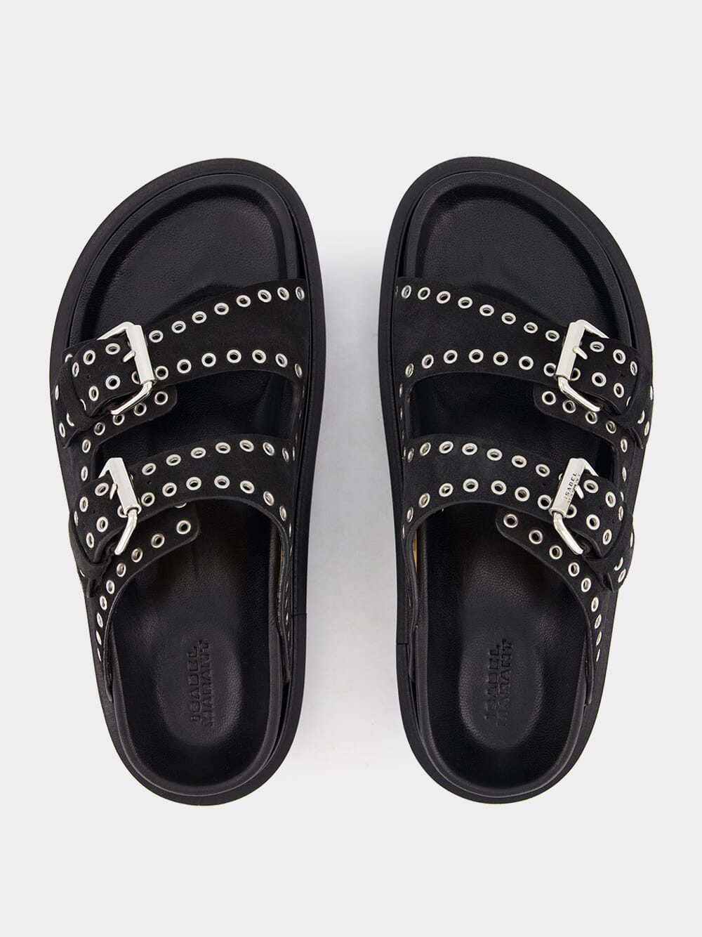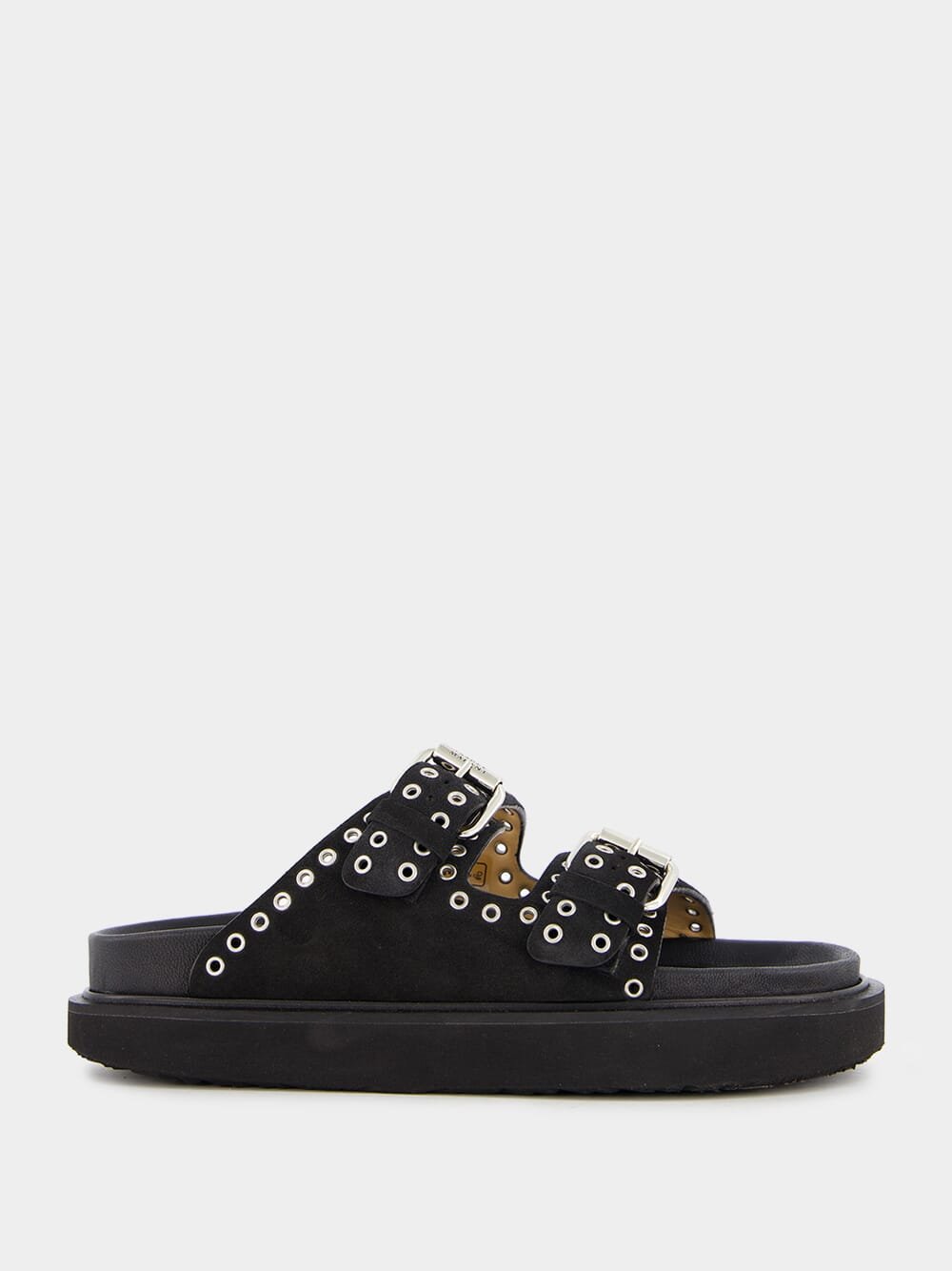 Lennyo Eyelet-Embellished Black Sandals. Crafted from premium calf leather and suede, these sandals feature a chic round open toe design. The eyelet embellishments and branded insole add a touch of contemporary flair, while the comfortable flatform sole with a durable rubber sole ensures all-day comfort. Effortlessly slip into style with the convenient slip-on design and secure your fit with the two buckle-strap fastenings.
