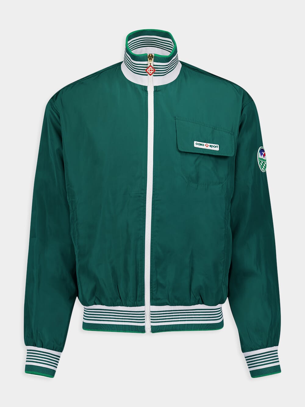 Logo-Patch Green Track Jacket, crafted from premium cotton for comfort and style. The high neck and long sleeves offer a contemporary design, while the logo patch at the chest and sleeve adds a trendy flair. With a chest flap pocket and stripe trim, this jacket combines functionality and fashion effortlessly. The front zip fastening ensures easy wear, and the straight hem provides a polished finish.