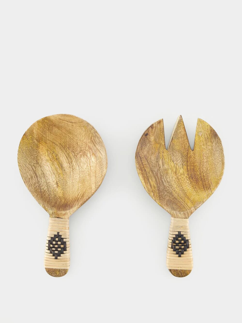 Wooden Serving Set with Bamboo, a harmonious combination of mango wood and bamboo. This eco-friendly set of 2 adds a touch of natural elegance to your dining experience. Embrace the unique charm of each piece, as natural materials may vary in shape and color. For optimal care, hand wash is recommended.
