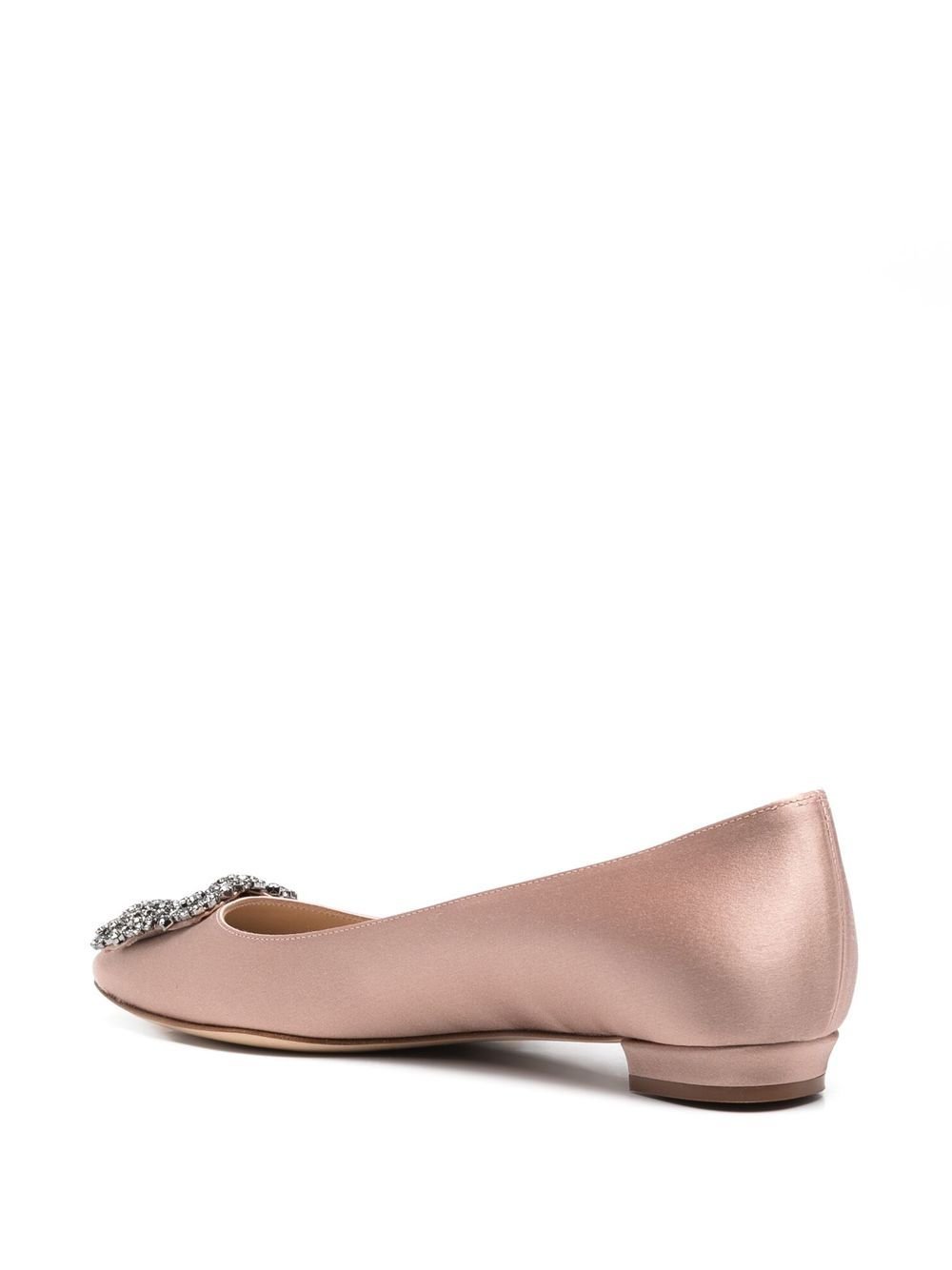 Manolo Blahnik Hangisi pink satin almond toe flat ballerinas with a square crystal buckle.
