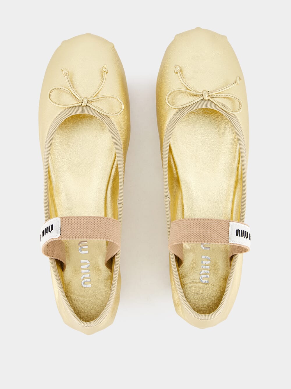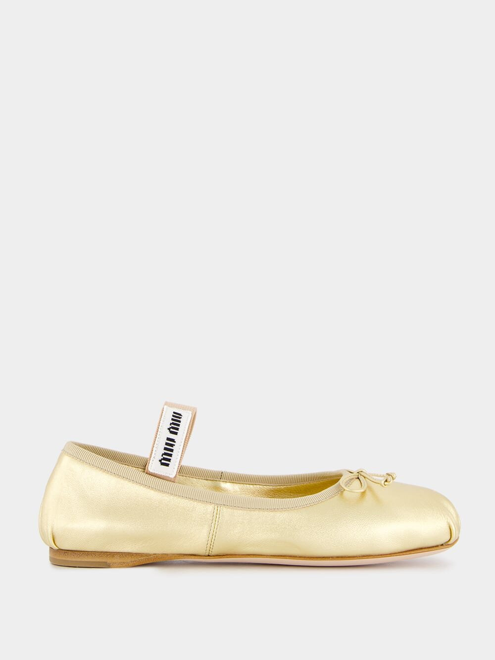 Crafted from smooth grain leather for a luxurious feel, these gold ballet flats feature a stylish logo-print strap, classic round toe, and elegant bow detailing. With a branded insole for comfort and a flat sole, they offer both style and ease of wear. Slip into effortless elegance with these iconic Miu Miu ballet flats.