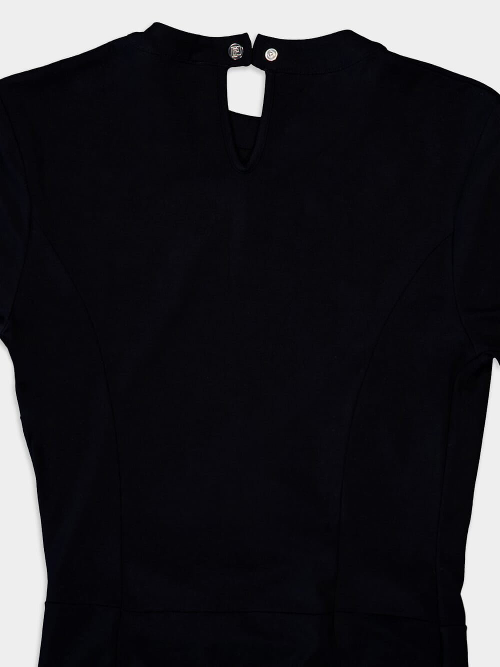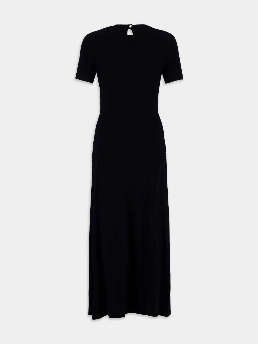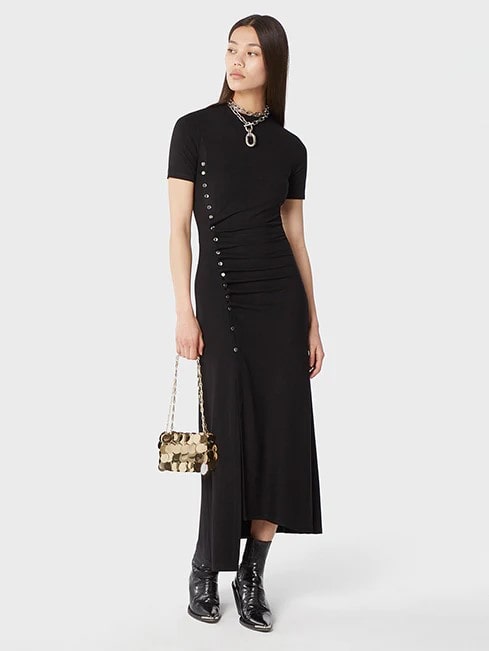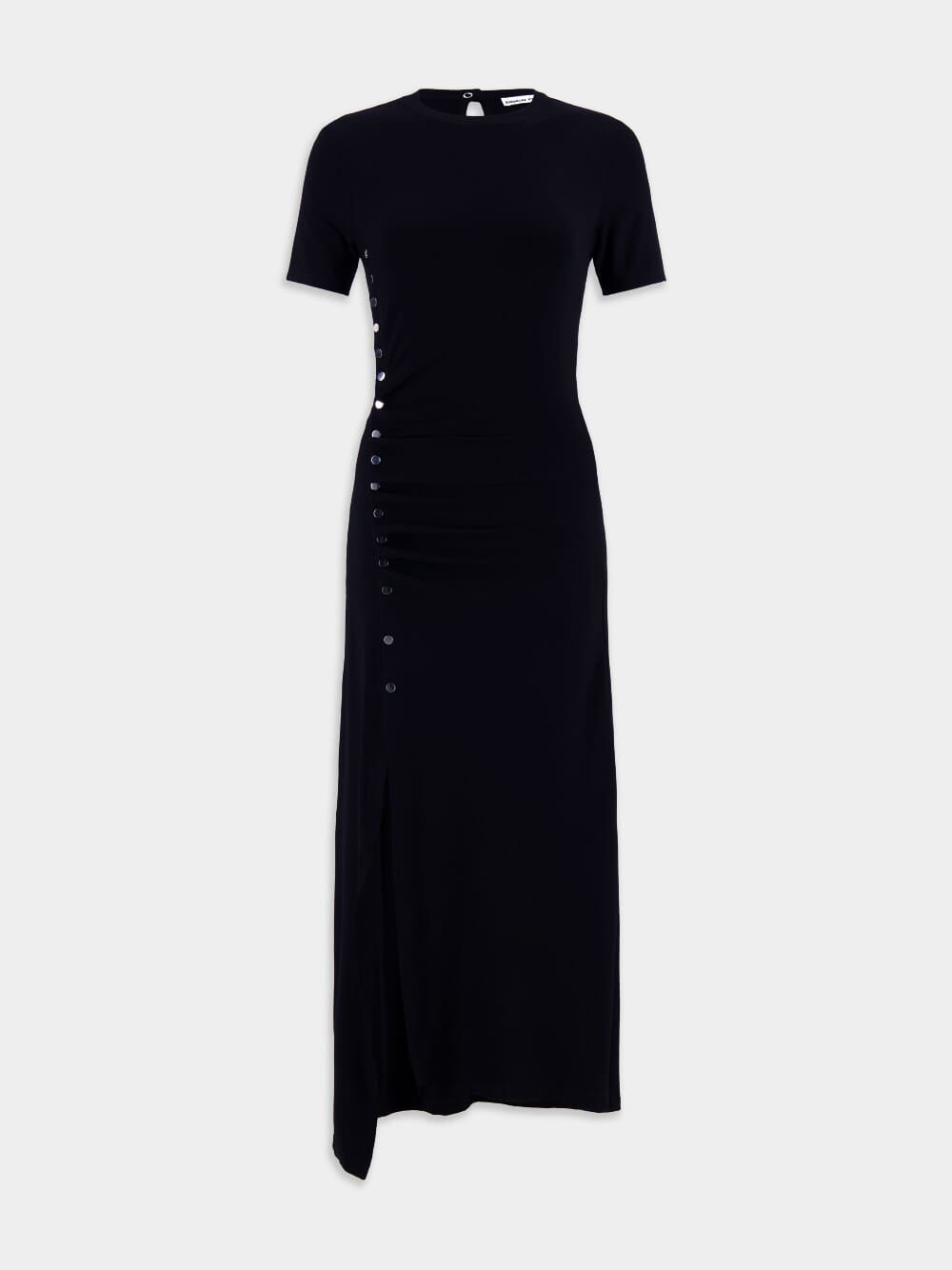This short-sleeved midi dress is a luxurious blend of black stretch jersey, featuring silver snaps that add a hint of subtle pleating.